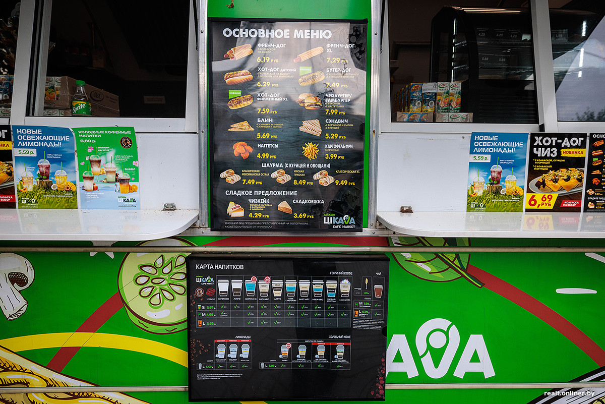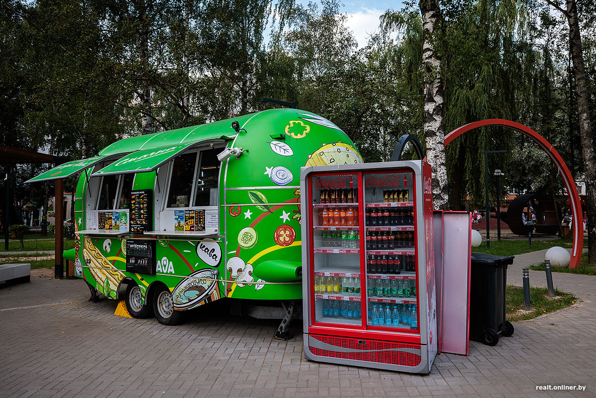 Зона фуд-корта пока невелика и представлена фургоном ярко-зеленого цвета — не заметить его сложно. Здесь продают хот-доги, шаурму и другой фастфуд. Наверняка во время летней сессии тут были очереди, но сейчас вокруг не так много желающих приговорить свою суточную норму калорий.