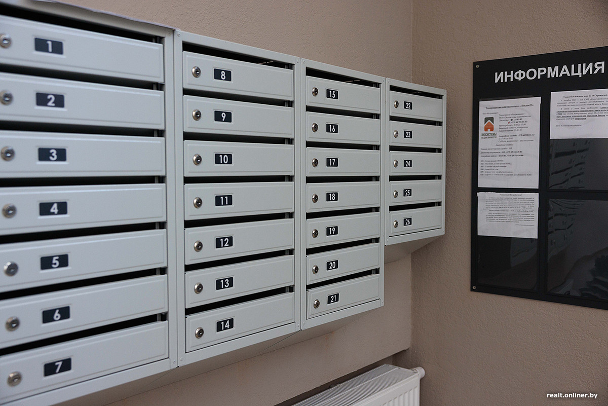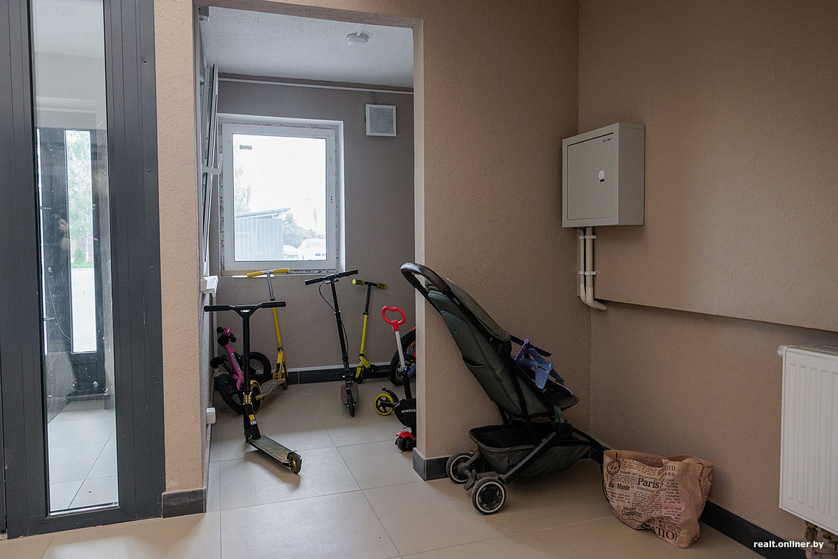 На первом этаже — холл с почтовыми ящиками. По бокам расположены два небольших помещения. Одно из них — это колясочная. Ее уже облюбовали жильцы — расставили самокаты (велосипеды хранятся под навесом на улице). Во второй комнатке, по задумке застройщика, можно организовать рабочее место для консьержа.