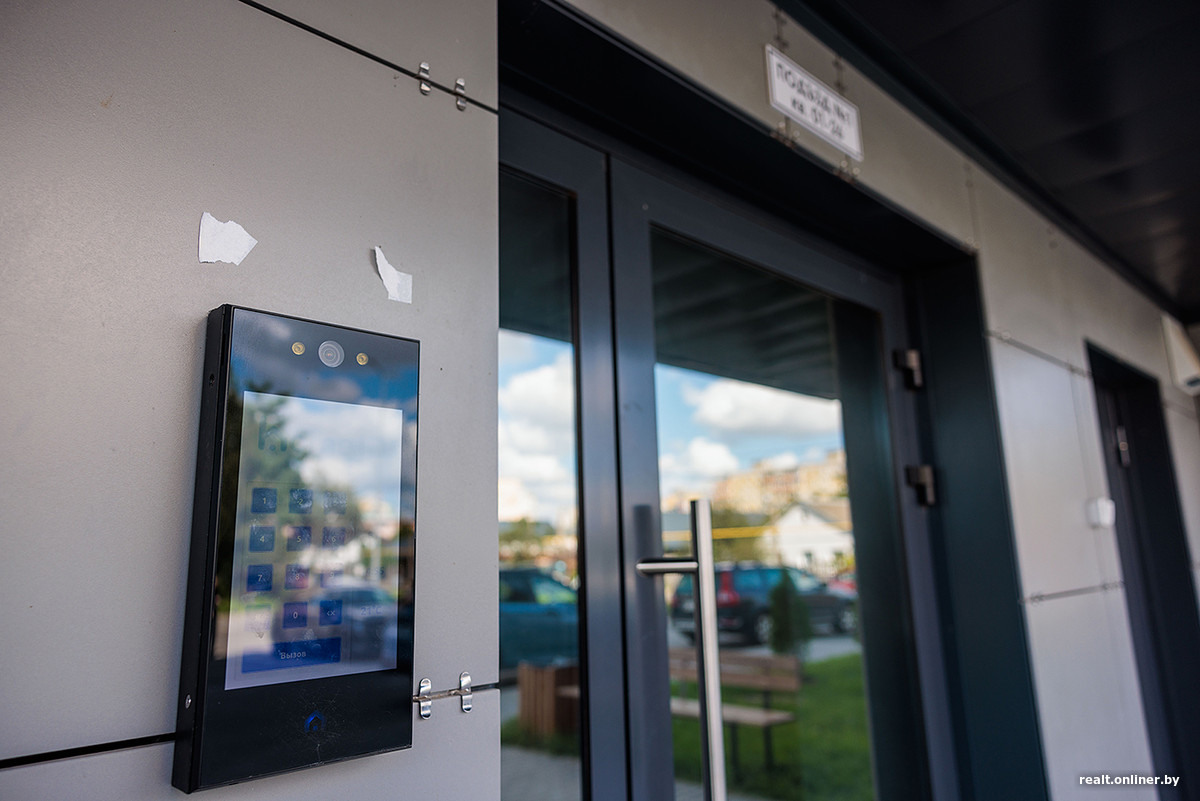 Вход в единственный подъезд — через зеркальную дверь с современным сенсорным домофоном.