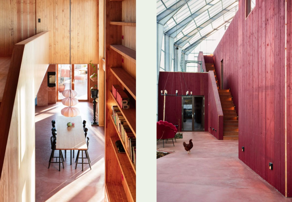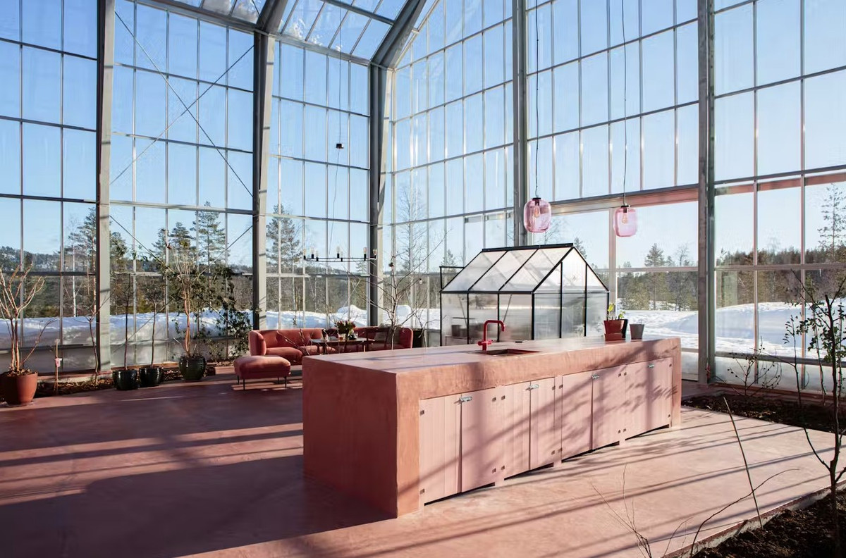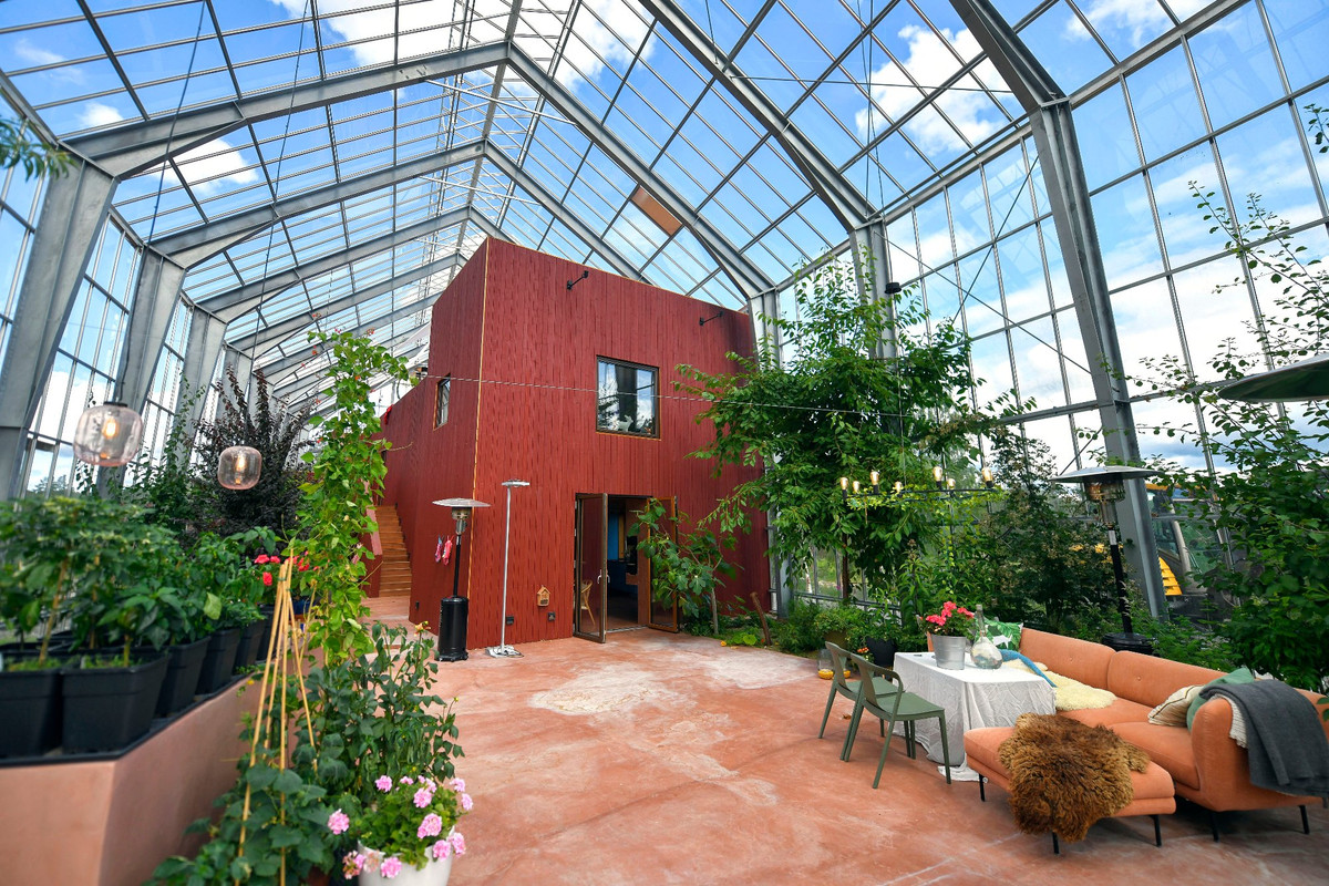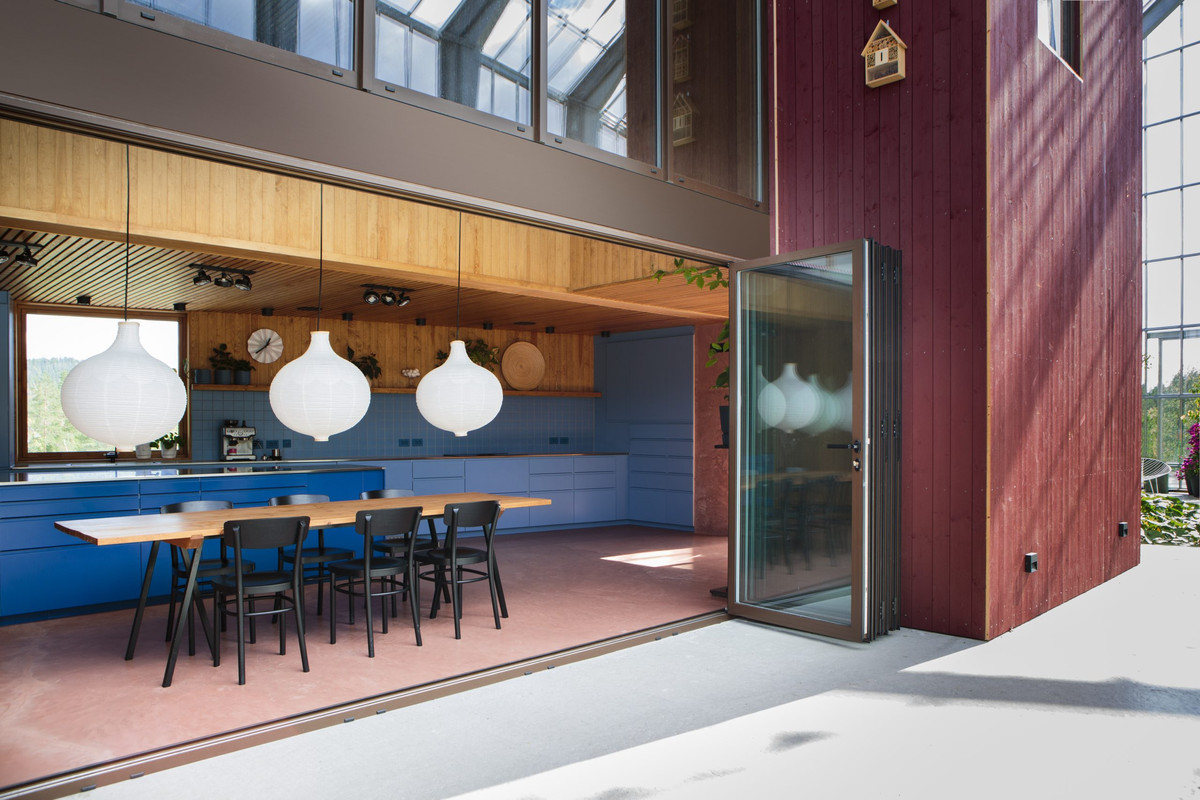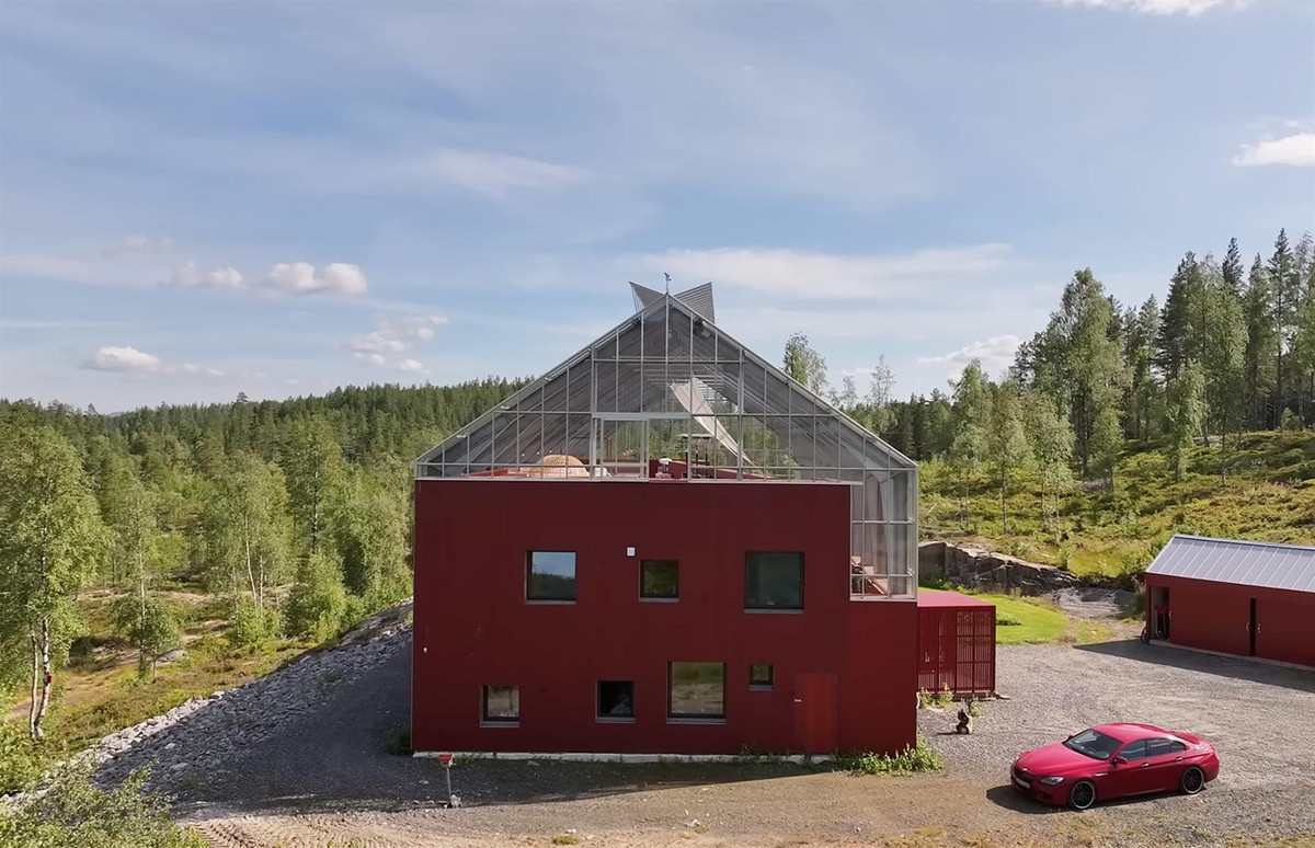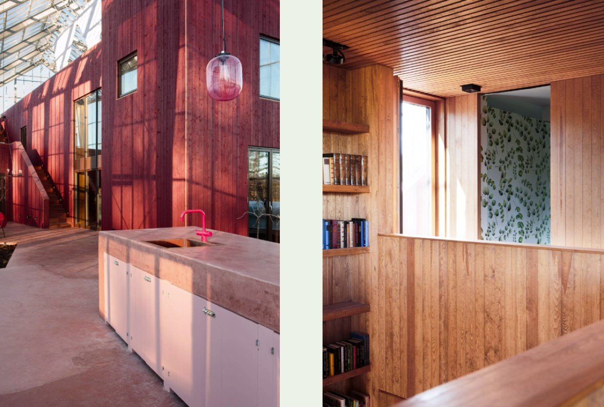 Следующим шагом стало строительство внутри двухэтажного дома для семьи с двумя детьми, площадь которого почти совпала с площадью теплицы — 380 квадратных метров. Наличие крыши, пусть и стеклянной, над головой, позволило строителям не зависеть от погоды. Это оказалось еще одним преимуществом решения. Форма дома по-скандинавски проста и минималистична, а выбранный темно-красный цвет отсылает к традиционному для региона «фалунскому» оттенку. Этот пигмент был побочным продуктом производства на огромном медном руднике в Фалуне, а потому повсеместно использовался в народной архитектуре и в Швеции, и в Норвегии.