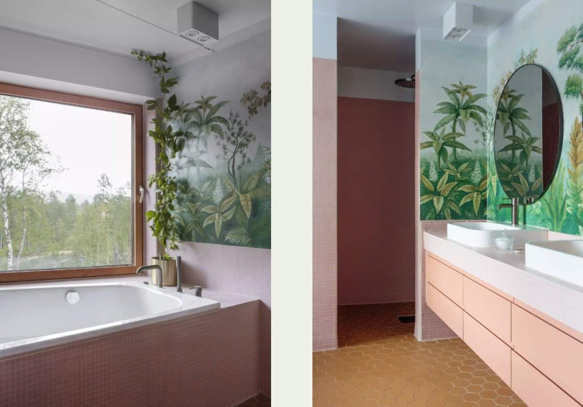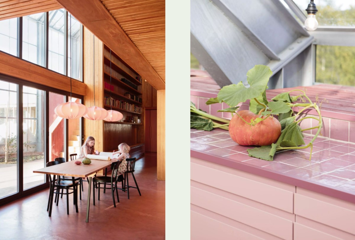 «Одним из моих требований был пол, не требующий ухода, по которому можно было бы ходить с цветочными горшками, землей и всем остальным, не боясь его повредить», — рассказывает Клев. Выходом стало использование розового микроцемента. Выбранный оттенок неплохо гармонирует со вторым основным цветом зелени, которой наполнена теплица. Для каждого же внутреннего помещения была выбрана своя цветовая схема, работала над которой одна из коллег хозяйки дома. Обе ее дочери смогли самостоятельно выбрать, как будут выглядеть их комнаты.