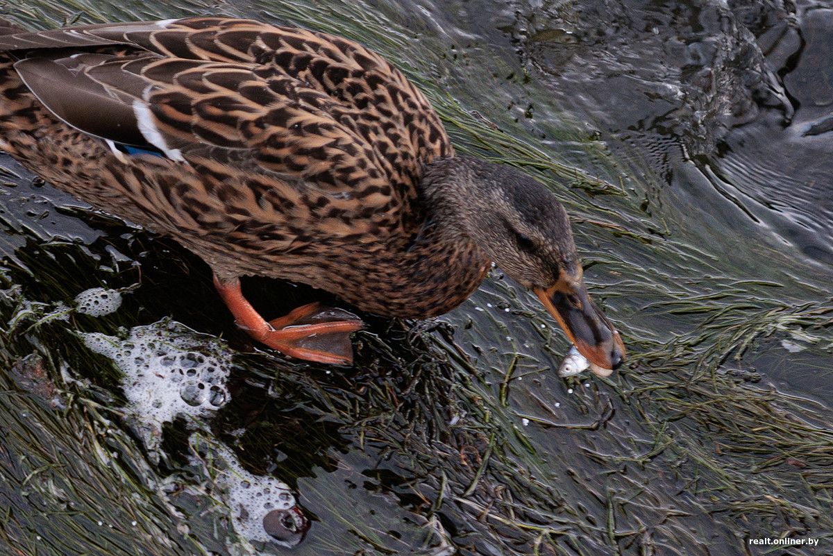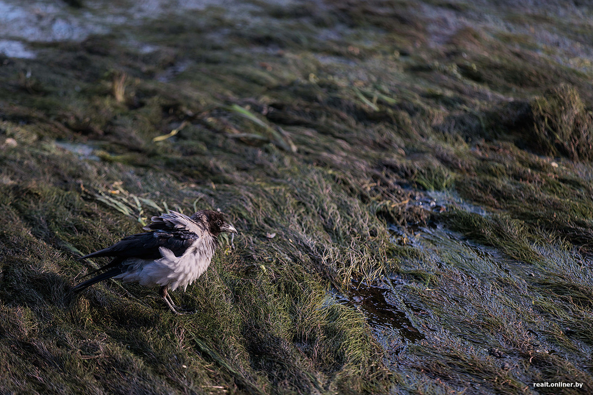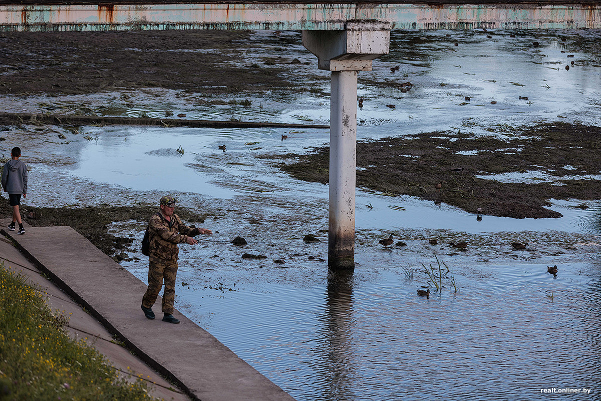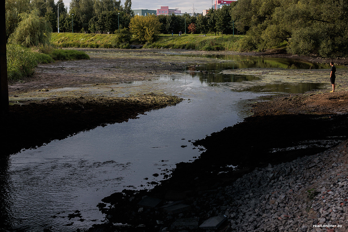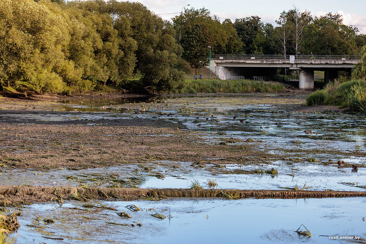 В районе улицы Денисовской минчане заметили странную картину: Свислочь обмелела так, что в некоторых местах стало видно дно. Вода отодвинулась от берега на приличное расстояние, поверхность реки покрылась тиной, а утки и другие птицы с трудом передвигались по мелкой жиже. Плюс появился неприятный запах.