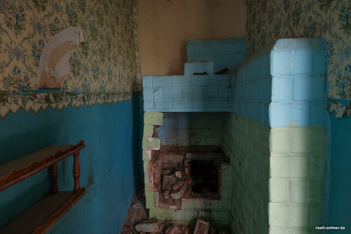 В некоторых комнатах все еще осталась мебель и отголоски советского быта в виде фотообоев с березками и гипсовых розеток для люстр. Печка, которая согревала жильцов в холодные дни, частично разобрана. Подвал не заперт, но спуститься вниз мы не рискнули: во-первых, в гости никто не звал, во-вторых, внизу наверняка темно и сыро.