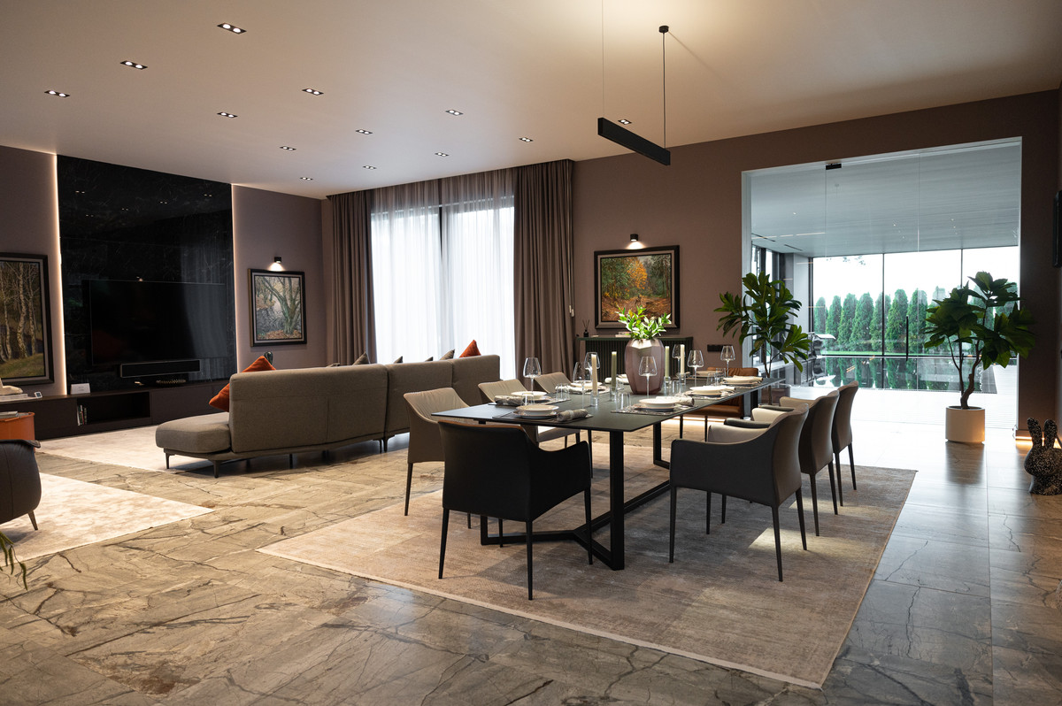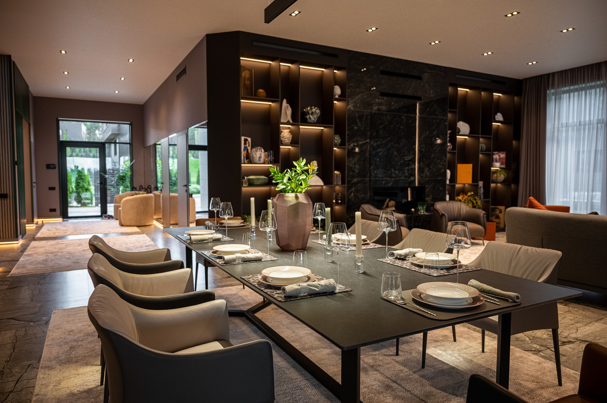 Переступаем порог пока еще не обжитой виллы и первым делом удивляемся ее масштабам: благодаря раздвижным панорамным окнам кажется, что пространства в жилых зонах еще больше. Плюс добавьте сюда высоту потолков в 3,4 метра, которые отбивают эхом любой громкий звук.