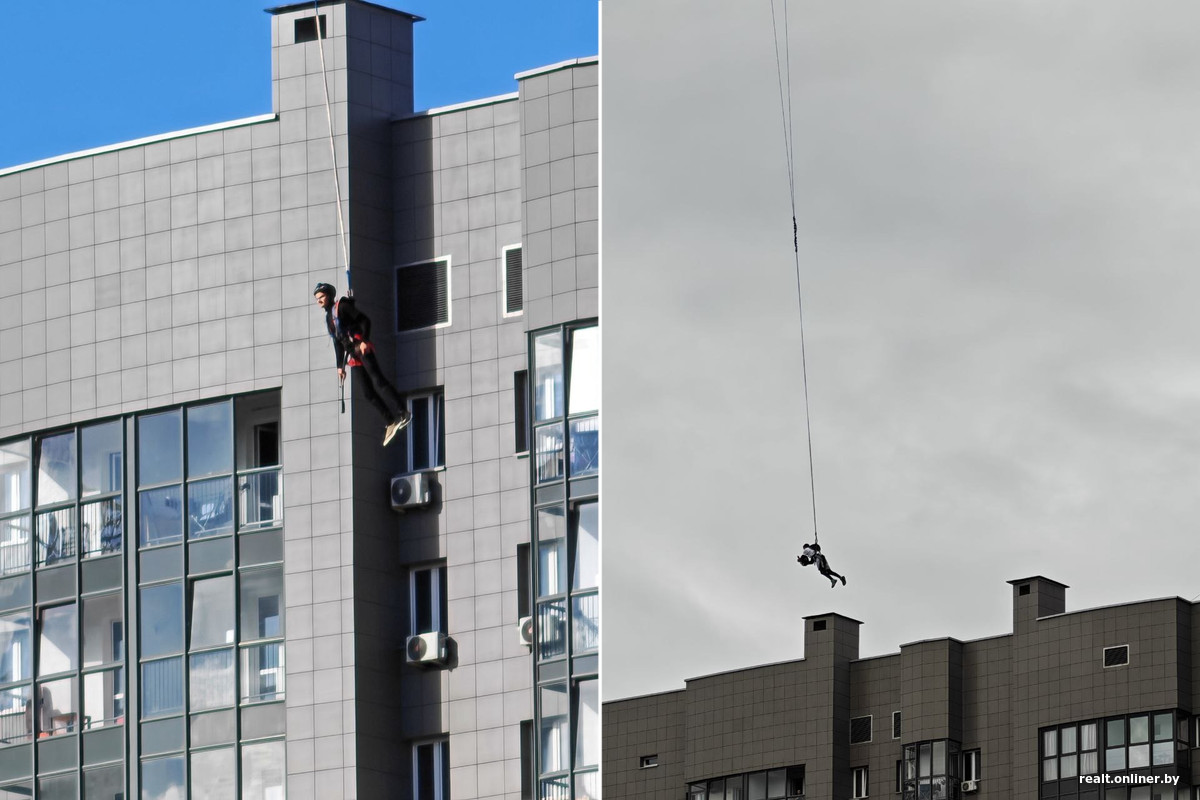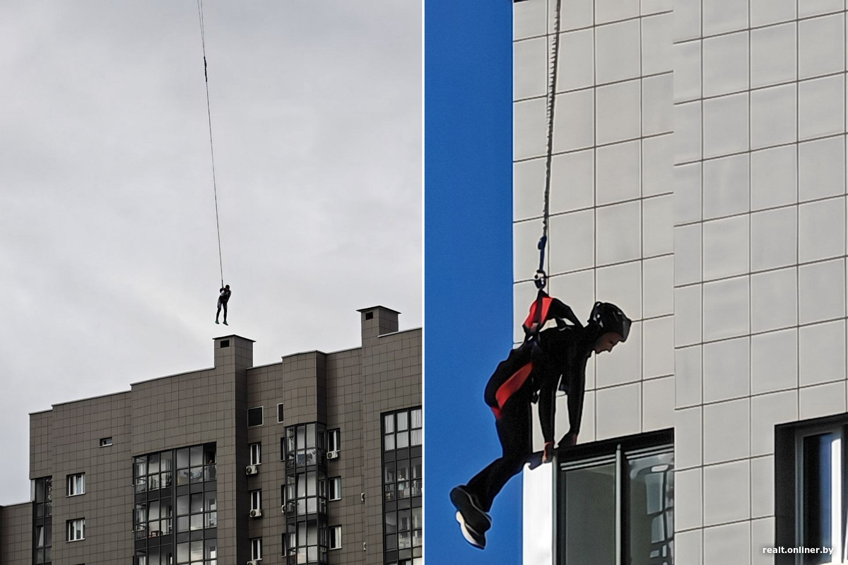 Бодрящие нервы ролики разошлись вчера, кажется, по всем соцсетям: с крыши самого высокого жилого дома в Минске спрыгнул человек. Со специальной веревкой, конечно. Но все равно выглядело это волнительно. Кто он? Зачем это сделал? Будет ли прыгать еще? Мы узнали ответы на все вопросы.