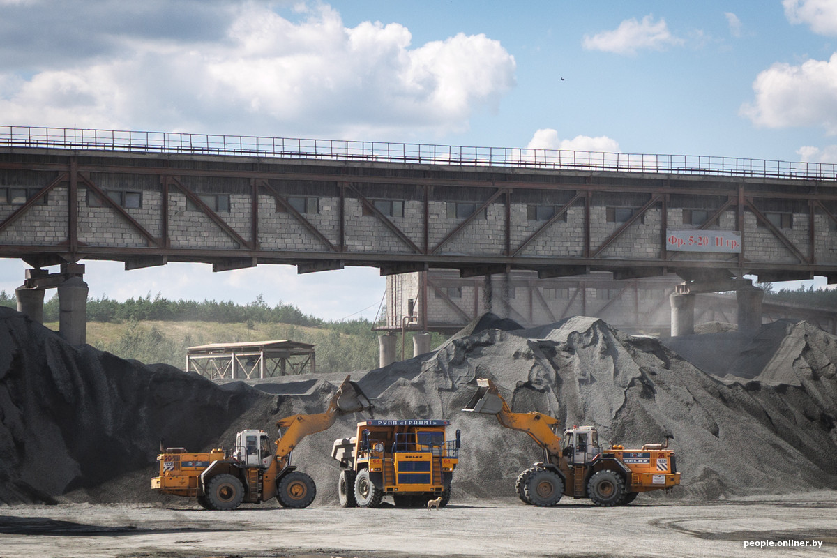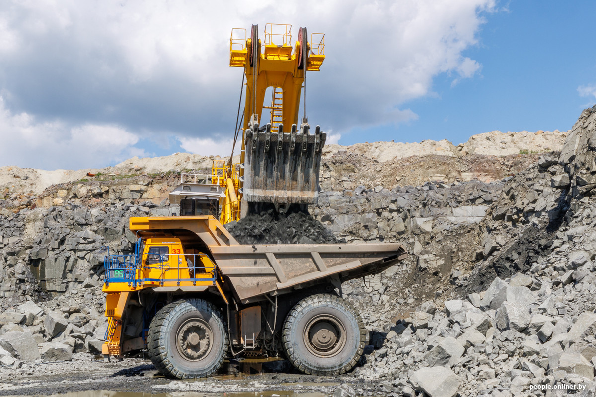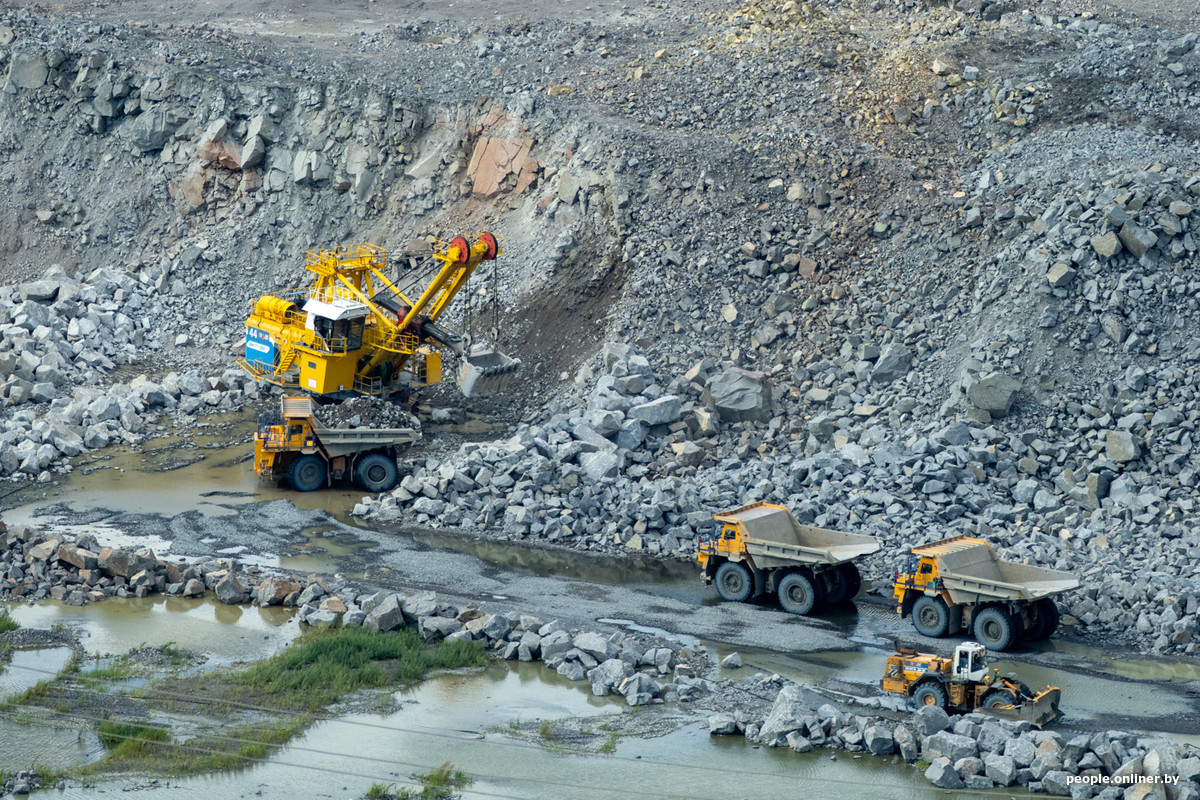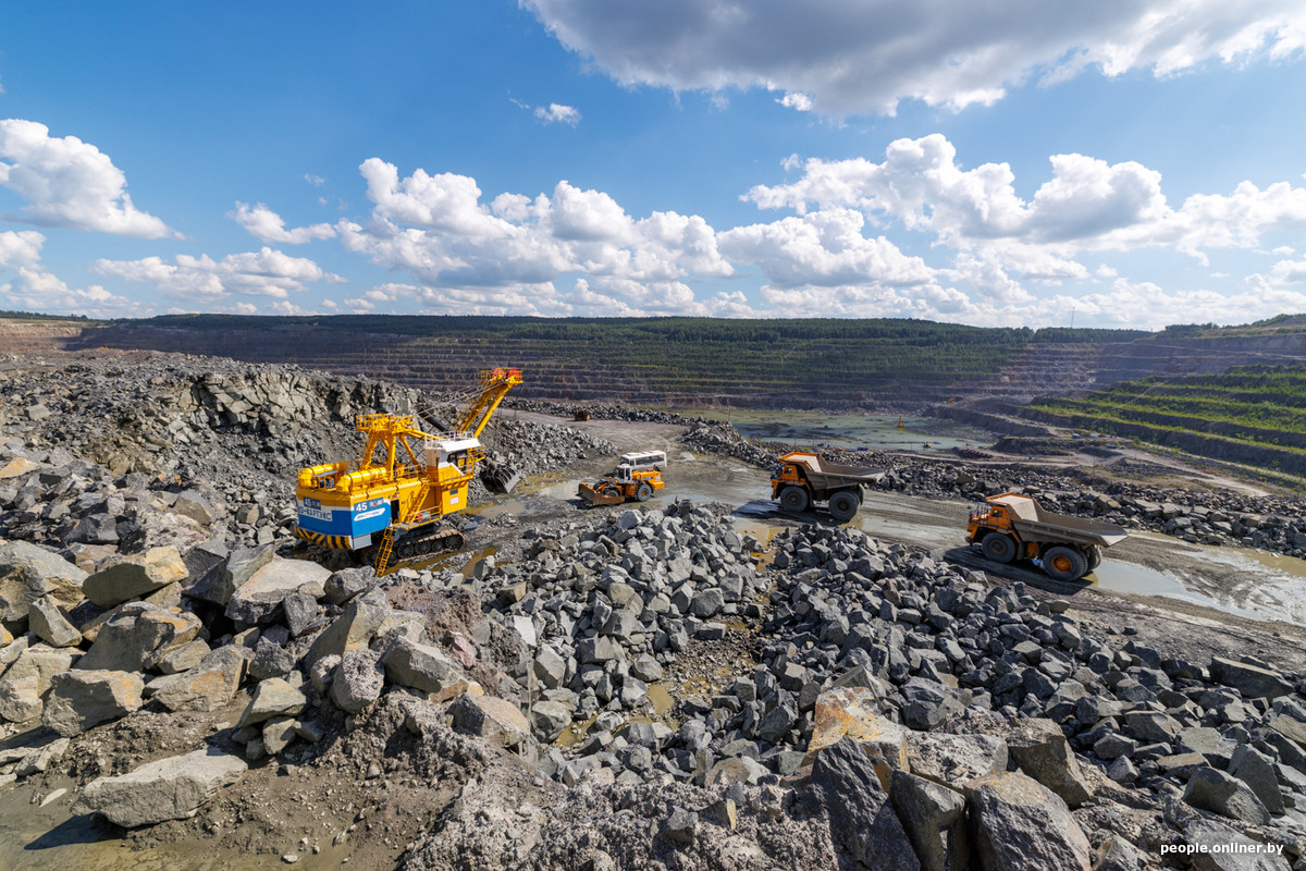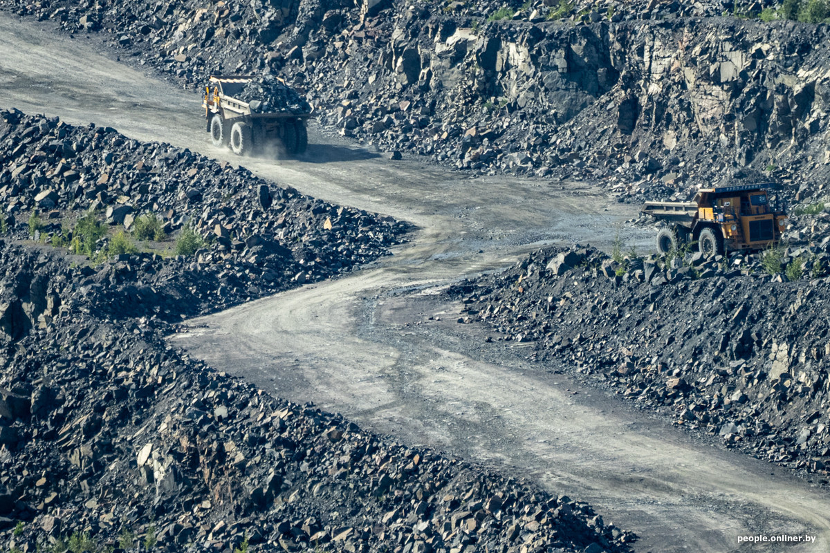 Началось все в 1960-х, когда рядом с небольшим рабочим поселком Микашевичи обнаружили большие залежи строительного камня. В 1973-м здесь начали разрабатывать карьер, а через два года стали добывать гранит и диорит (пришлось снять 30 метров песка с поверхности), из которых производят популярный в строительстве щебень. За полвека карьер углубился на 150 метров и растянулся с севера на юг на 2 км, а с запада на восток — на 3 км. По словам сопровождающих, сегодня это крупнейшая открытая горная выработка в Центральной Европе. Самому большому гранитному карьеру, расположенному в американском штате Вермонт, он уступает 30 метров. Но белорусский карьер планируют разрабатывать до 2050 года, и в планах — как минимум еще четыре горизонта. Так что в будущем он может стать глубже.