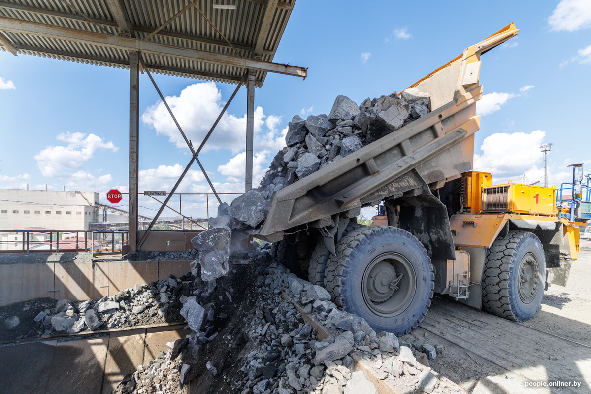 Сергей дает гудок, и очередной БЕЛАЗ отправляется на завод, а мы пока говорим о правилах, которые обязательно нужно соблюдать. Как минимум для своей же безопасности. Оказывается, передвигаться в карьере можно только на машинах — ходить самостоятельно запрещено. У каждого машиниста должен быть допуск по электробезопасности, ну и все обязаны носить спецодежду: каску, ботинки и костюм. Случаев, чтобы кого-то засыпало породой, здесь не бывает. Как объясняет Сергей, все соблюдают технику безопасности и во время работы экскаваторов к породе не приближаются.