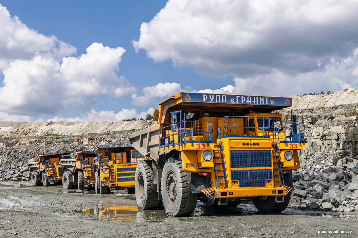 Оставляем пока Сергея и решаем прочувствовать, каково это  проехать в кабине настоящего БЕЛАЗа. На «Граните» работает порядка 50 самосвалов грузоподъемностью от 60 до 130 тонн. Рядом с «дробилками», куда сгружают гранит, я взбираюсь на один из самосвалов и вскоре мчусь по микашевичскому ухабистому серпантину. Ну как мчусь? Особо тут не разгонишься, и водитель рулит мощной машиной аккуратно. Максимальная скорость составляет около 40 км/ч, но чаще всего прибор показывает не больше 20.