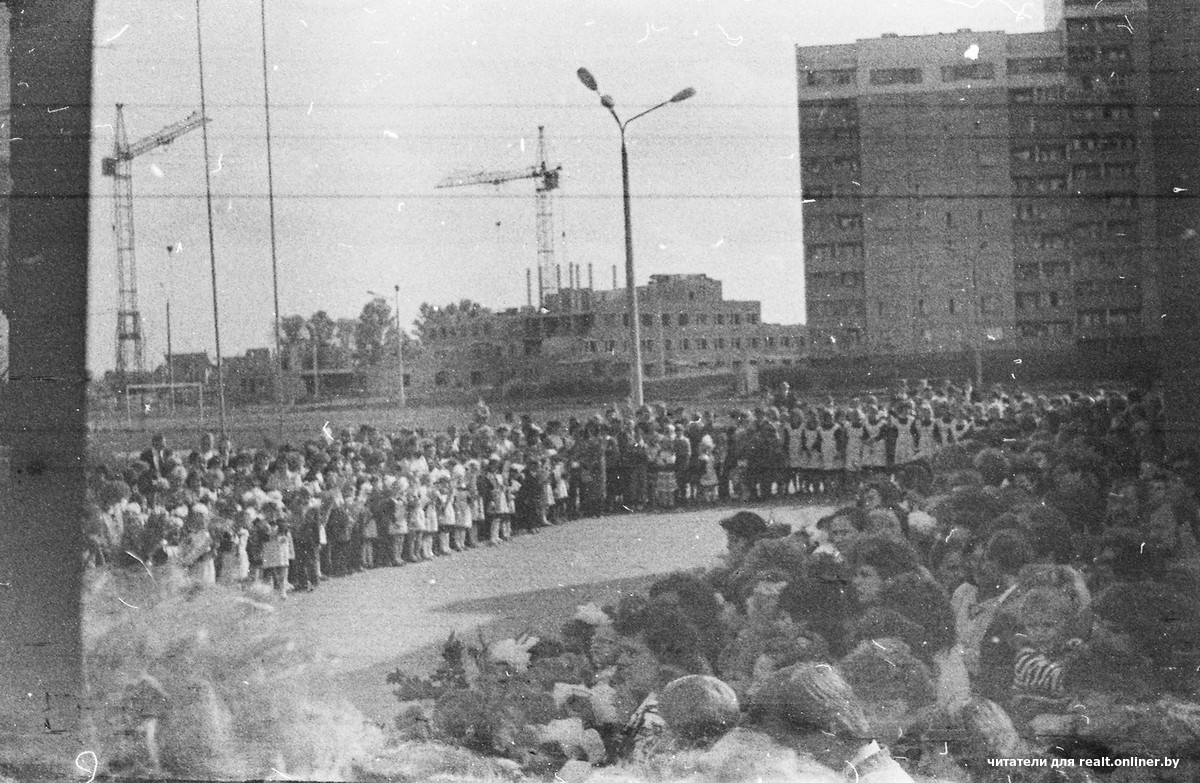 Снимки за 1-е сентября, похоже, делали из двора школы №180. Впервые она приняла детей в 1987-м. Качество фотографий не лучшее, но все, что нужно, видно: ребятня с цветами, учителя, родители и — фоном — строящийся город.