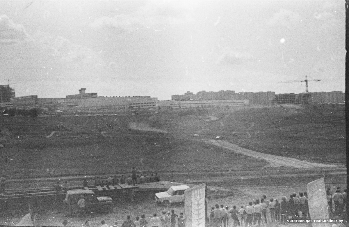 — Сдвоенная башня указывает на НПО «Гранат» по Лещинского, 8. Длинное низкое вытянутое здание в центре кадра — нынче мебельный магазин на Матусевича, вот его дорестайлинговый вид, — продолжает расшифровывать местность Александр. — И мы видим уходящую вверх, на юг, улицу Домбровскую. А в самой левой части строится, скорее всего, SkyTowers. Справа возводят дома Кунцевщины по Матусевича. Соответственно, это снято откуда-то из теперешней Домбровки-6 или Масюковщины-3. Примерно отсюда. Более того, на карте 1995 года на этом месте обозначен автодром!
