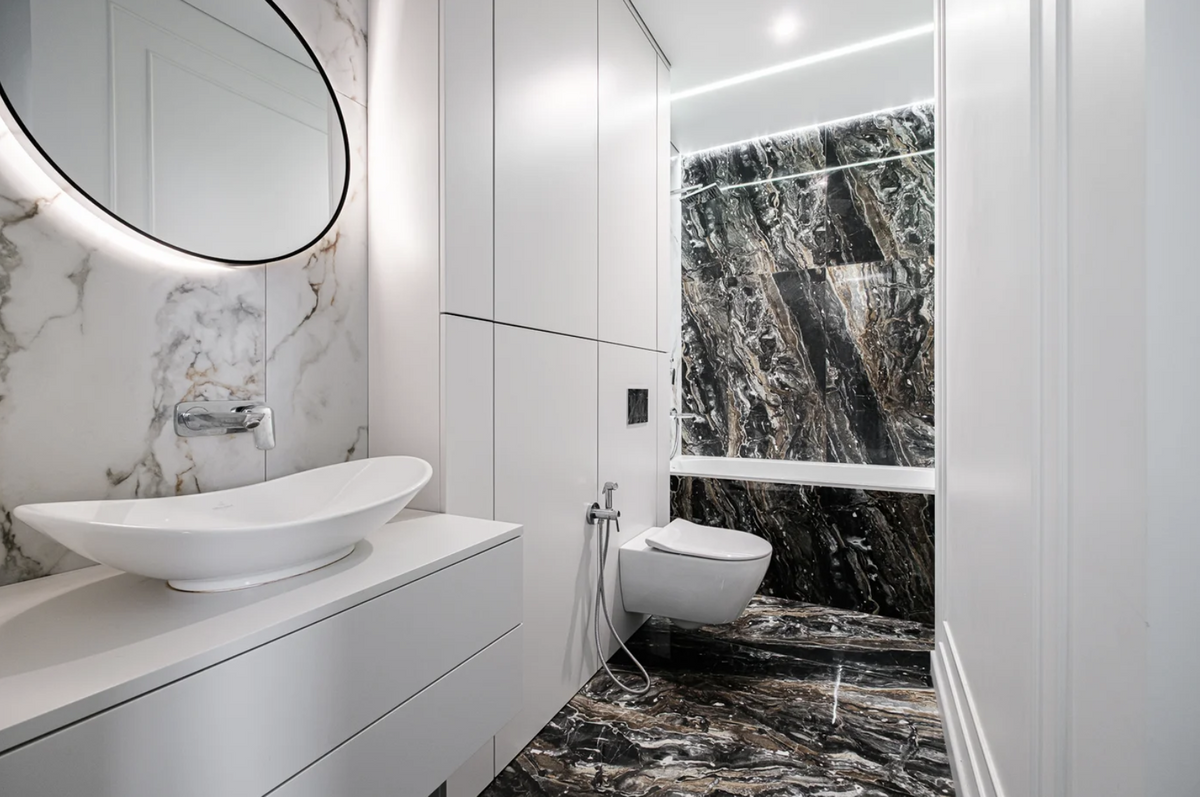 В санузле предусмотрена электрическая система подогрева пола. Эту зону обустроили с помощью сантехники и смесителя Villeroy&Boch, инсталляции Grohe, акриловой ванны, бойлера для подогрева воды и стирально-сушильной машины.