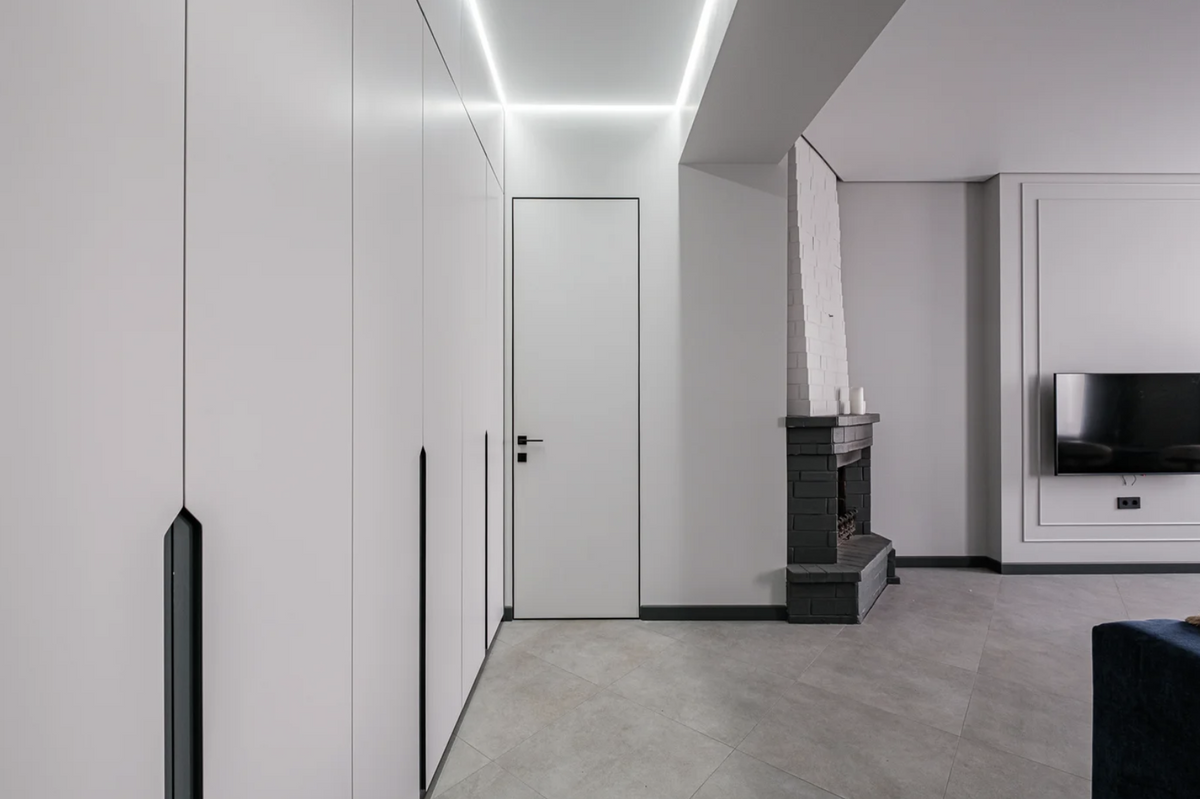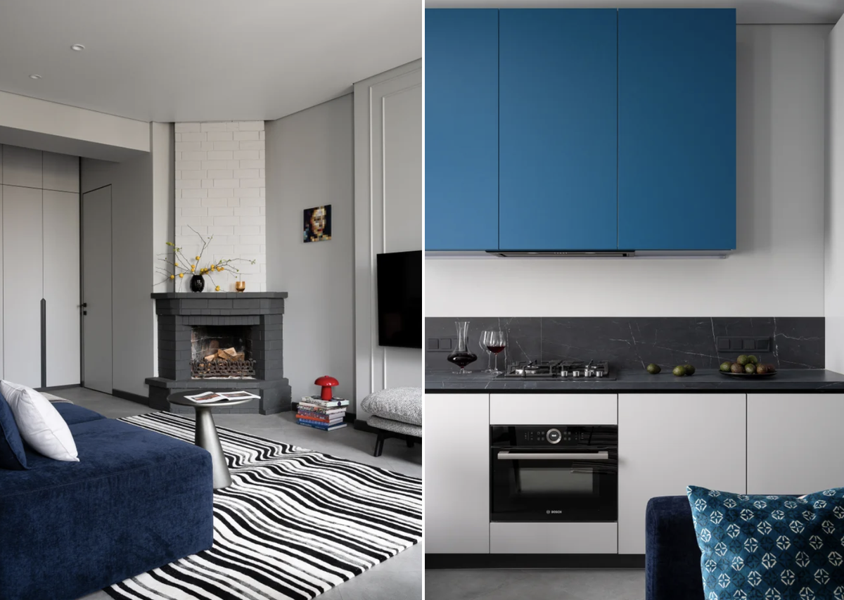 В целом интерьер выглядит минималистичным и спокойным. В кухне, соединенной с гостиной, обращает на себя внимание камин. Работает он или нет, неизвестно, но уютную атмосферу, определенно, создает.