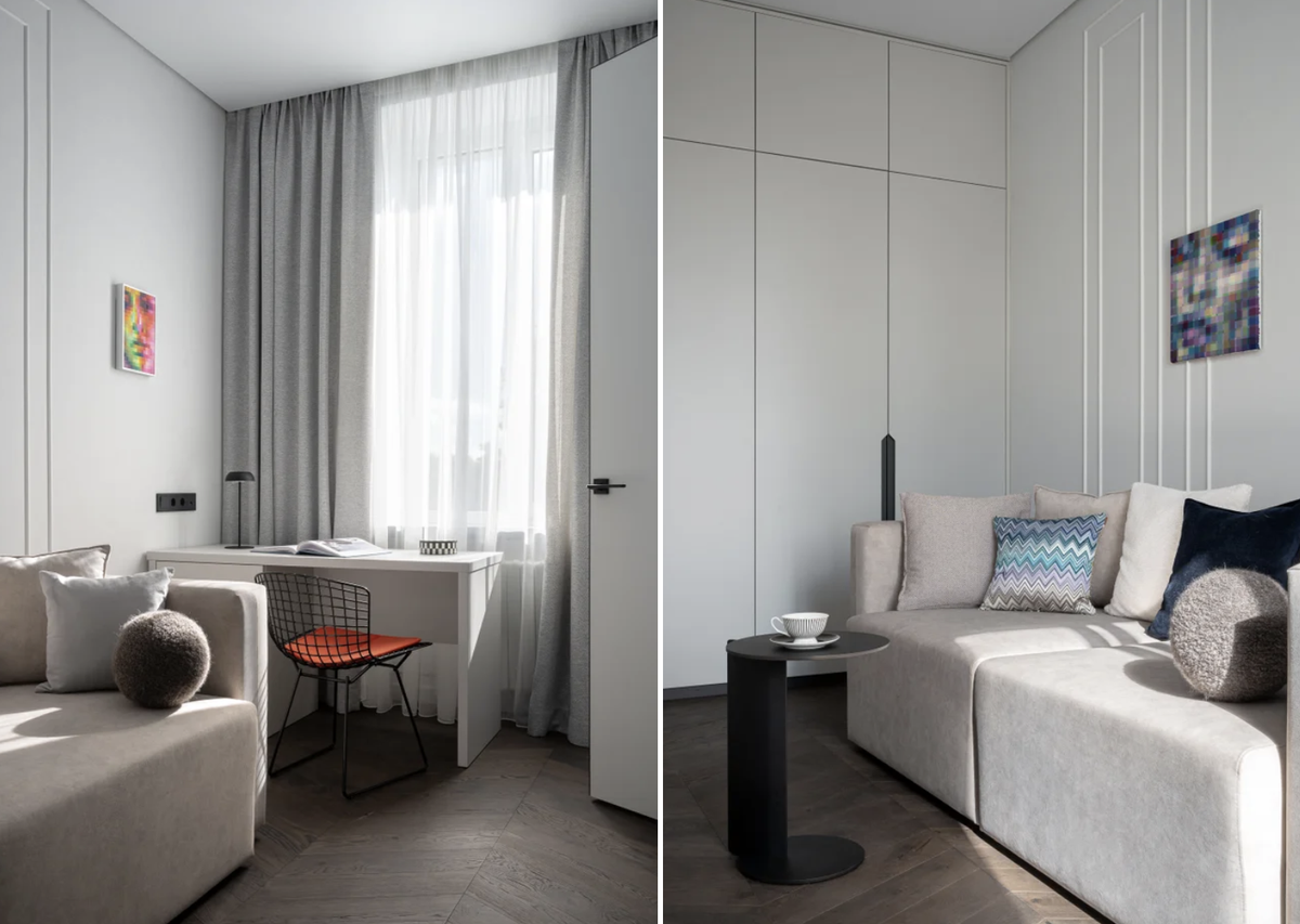 В квартире есть две жилые комнаты — спальня и детская. В комнатах на полу — дубовый паркет и итальянская плитка.