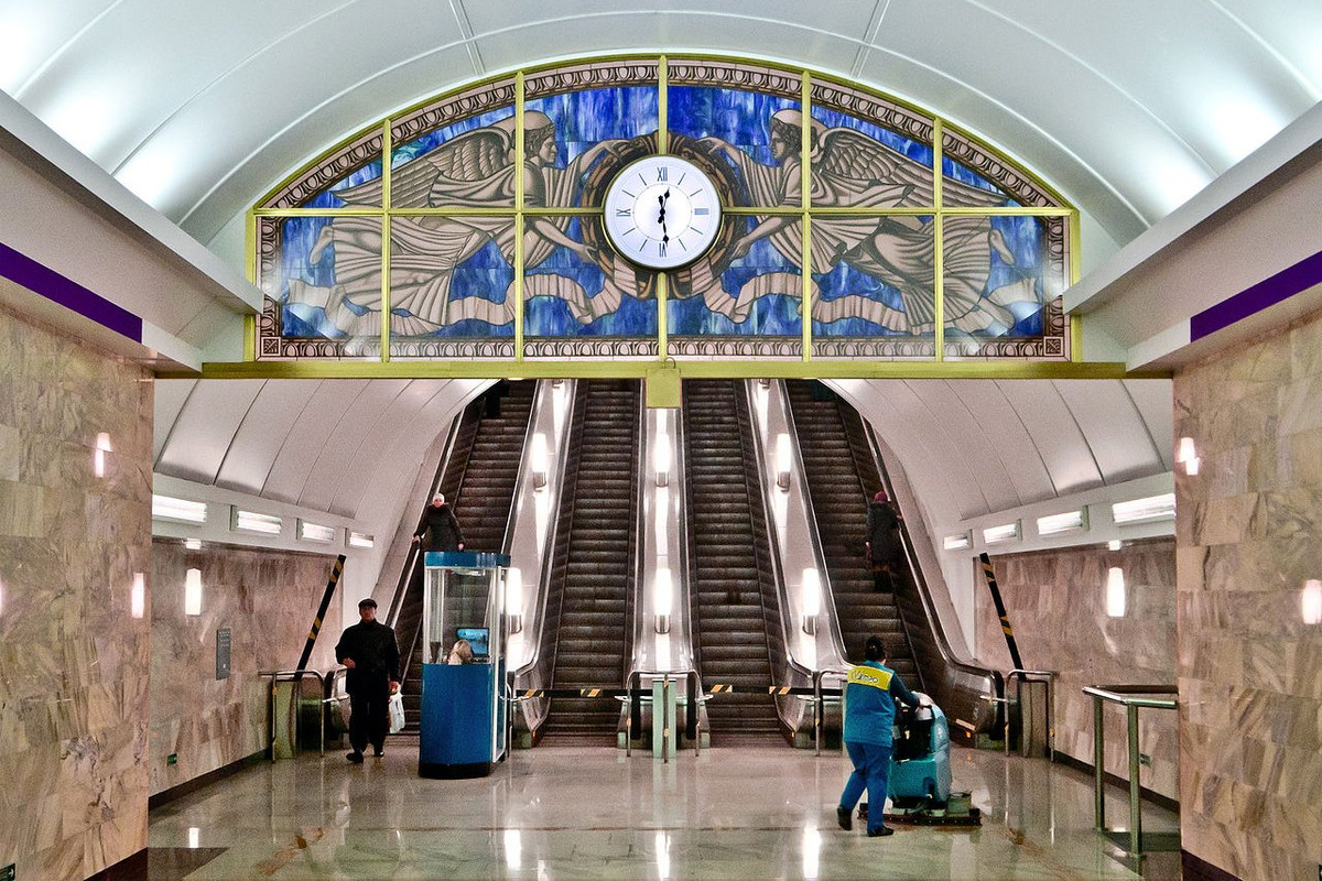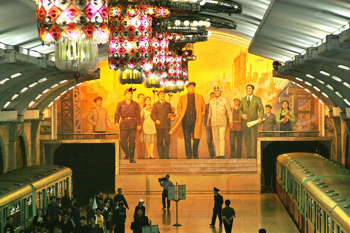 Интерьер станции — классический сталинский ампир: сводчатые потолки, массивные колонны, мозаики и патриотическая музыка. На торцевой стене — панно «Великий Лидер Товарищ Ким Ир Сен среди рабочих», а на боковых — сцены труда и социалистического строительства. Все строго по канонам: величественно, монументально и с идеологическим посылом.