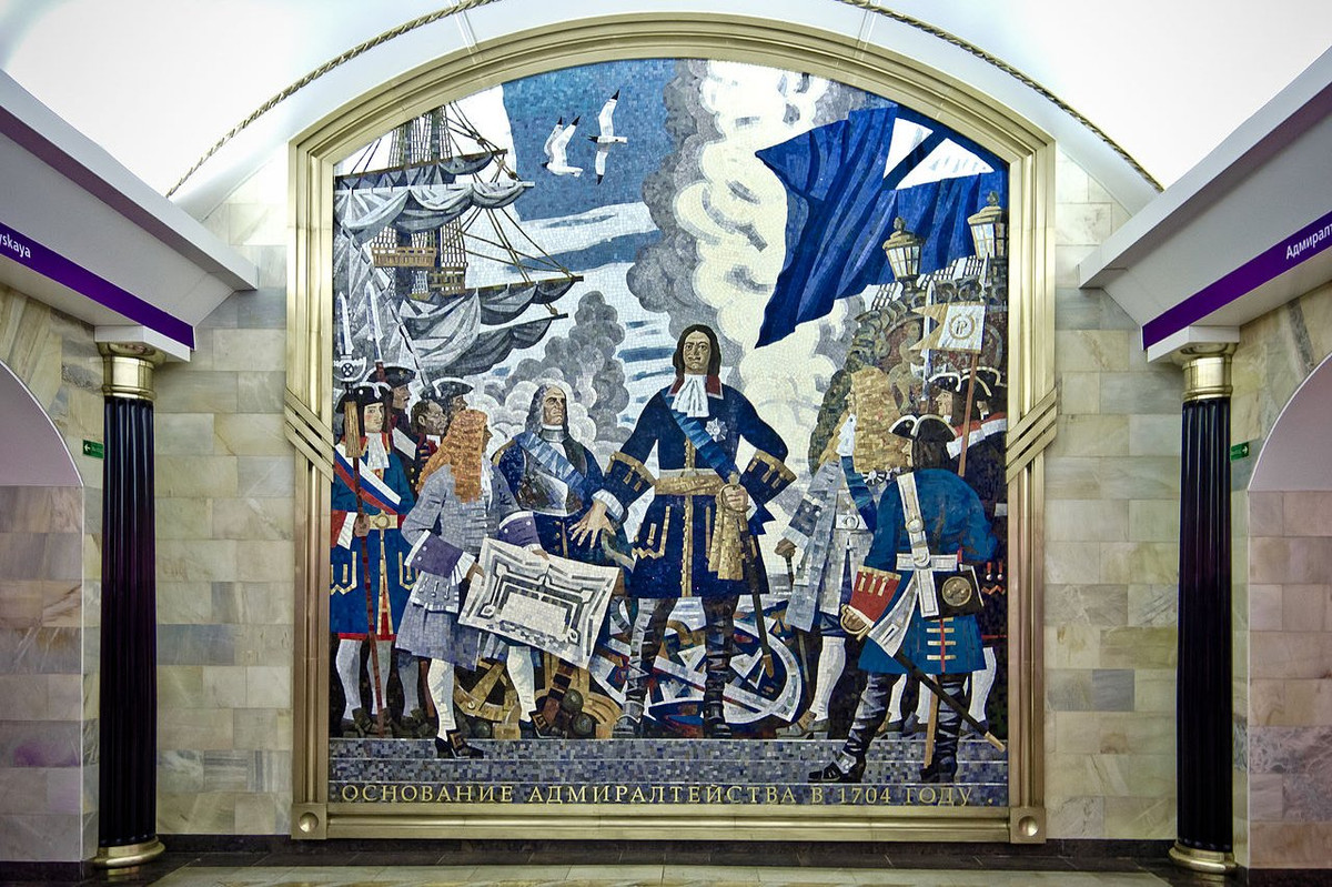Интерьер станции — дань эпохе Петра I и истории российского флота. Арки обрамлены черными колоннами из алюминиевого сплава, пол выложен серым гранитом с инкрустациями розы ветров, а путевые стены — мрамором цвета Балтийского моря. В торце — мозаика «Основание Адмиралтейства Петром I», между колоннами — горельефы русских адмиралов.