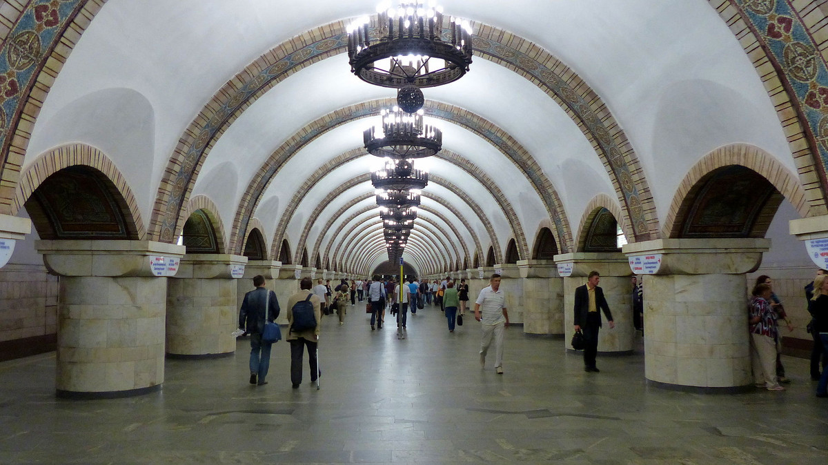 Одна из старейших станций киевского метро, «Университет», открылась в 1960 году. Глубина — 78 метров, а спуск к поездам проходит через двухмаршевый эскалатор с промежуточным вестибюлем — классика для глубокого заложения. Внутри — три зала, соединенные порталами и пилонами, все строго по канонам советского метростроя.