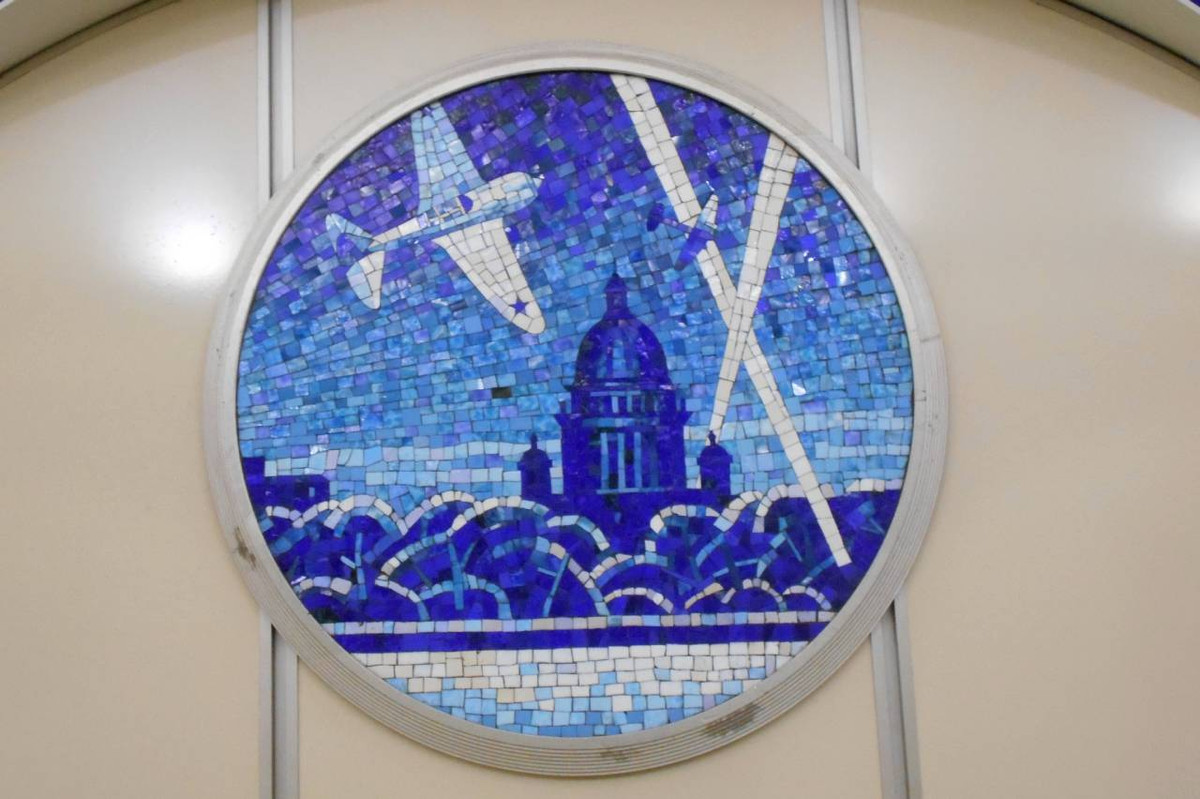 Оформление — с небесным уклоном. Над эскалатором — 40-метровое панно, посвященное российской авиации. Между колоннами — 18 мозаичных медальонов, приуроченных к 60-летию Победы: здесь самолеты военных лет, портреты авиаторов. Небесно-голубая гамма создает ощущение легкости и простора, будто станция не уходит вглубь земли, а наоборот — стремится вверх, к небу.
