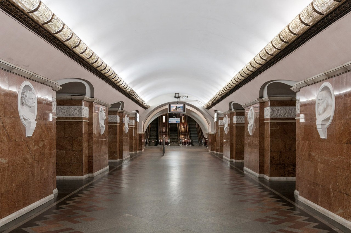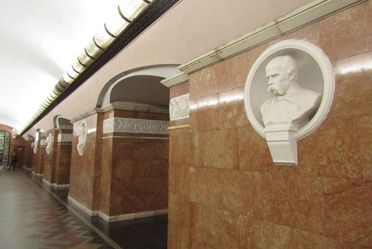 Но главное здесь — атмосфера. Интерьер выполнен в стиле сталинского неоклассицизма, с красно-коричневым мрамором, гипсовыми медальонами и бюстами выдающихся украинских деятелей науки и культуры. Такой цвет мрамора в отделке — отсылка к «красному корпусу» университета имени Тараса Шевченко, который находится рядом. Среди мраморных плит скрываются настоящие следы древней жизни — срезы раковин и аммонитов, — они словно тайные артефакты для внимательных пассажиров.