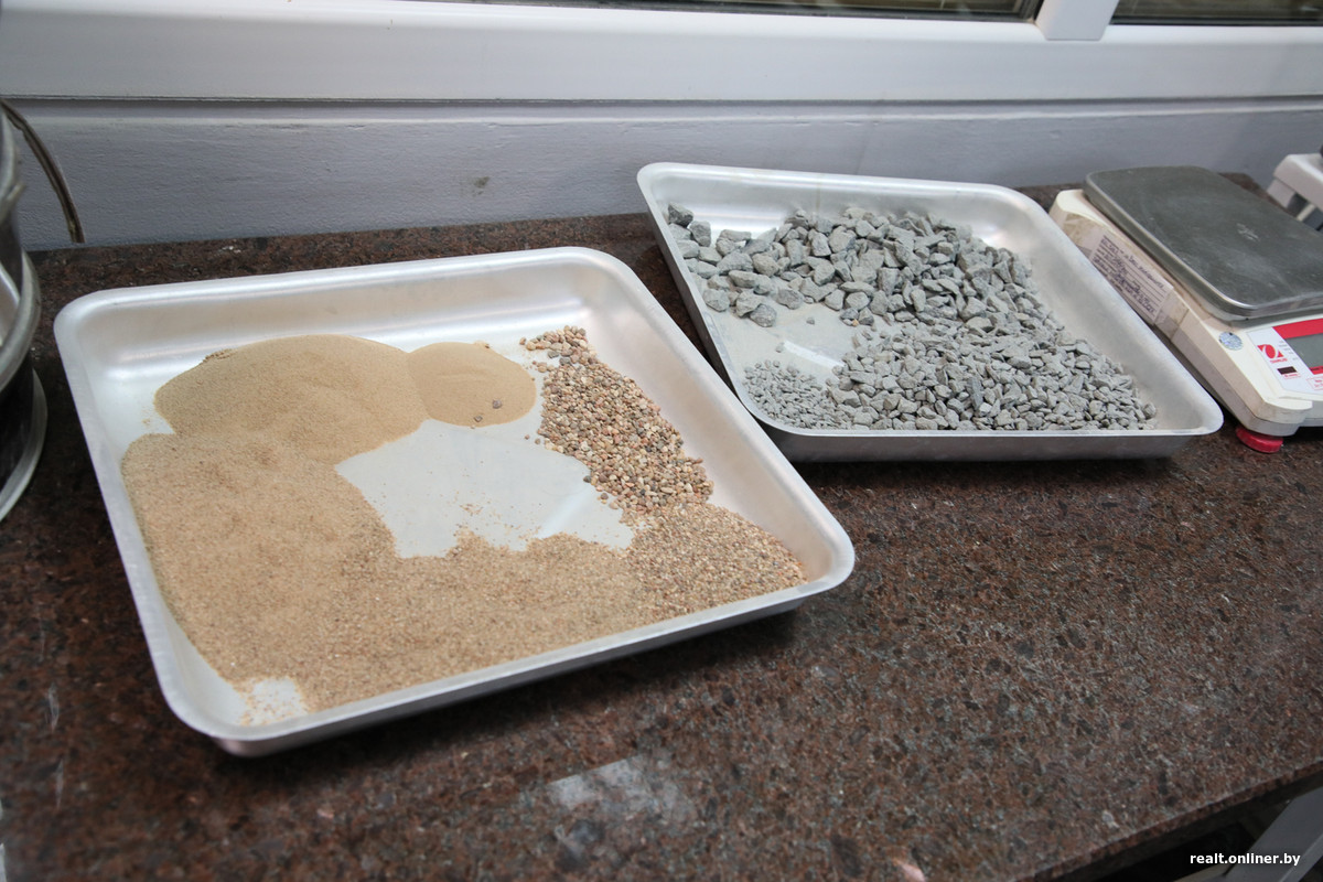 — Здесь мы производим входной контроль всех материалов. Это песок, щебень, цемент, вода, гравий. Также испытывается бетон на прочность, морозостойкость, водонепроницаемость.