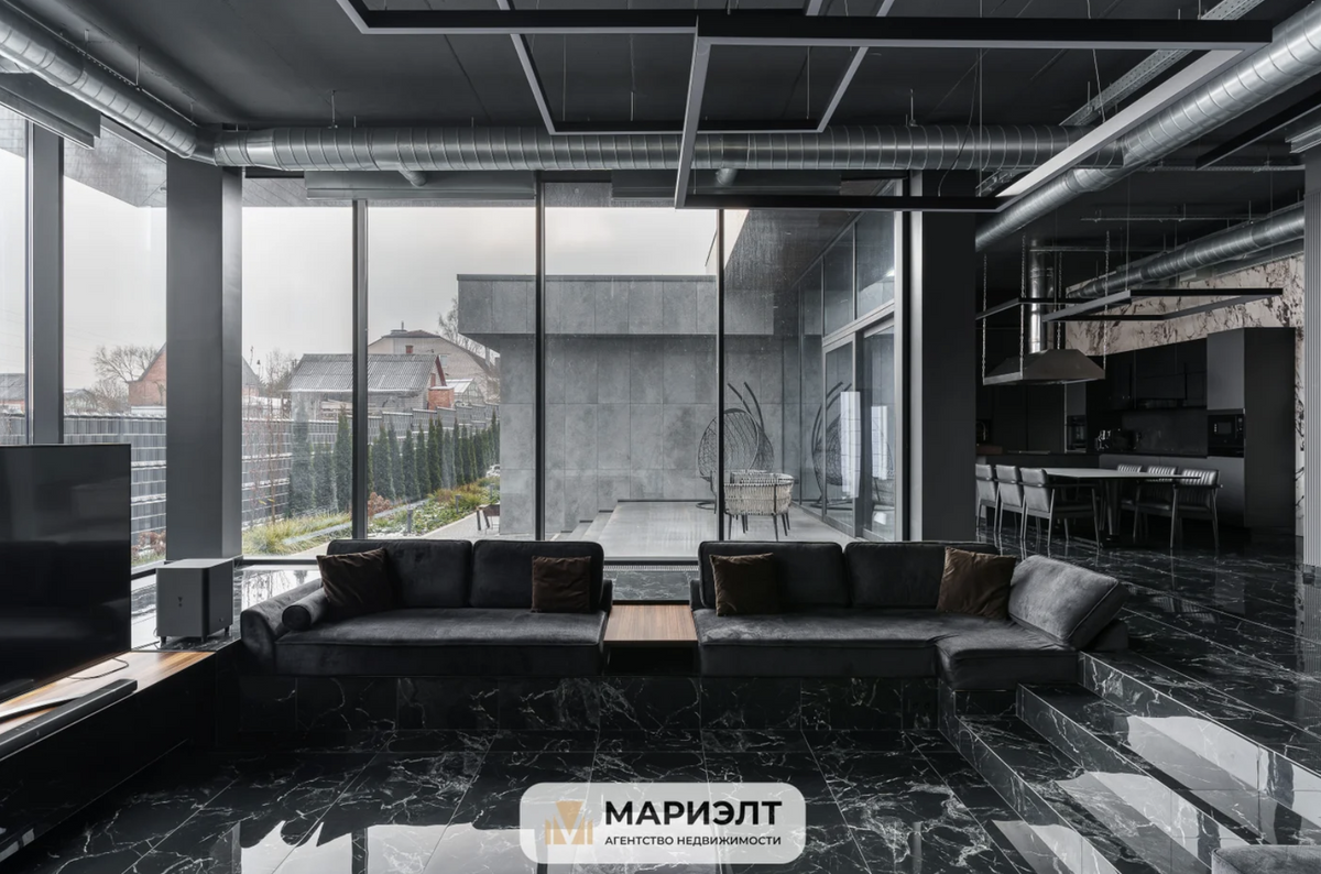 Снаружи этот дом выглядит как каменная крепость: прямоугольные формы, глухие стены графитового цвета, затемненные окна, в которых отражается окружающее пространство. А внутри спрятался суперсовременный интерьер с дорогими составляющими. Располагается коттедж в нескольких километрах от МКАД — в деревне Каменная Горка. Просят за такое жилье довольно много.