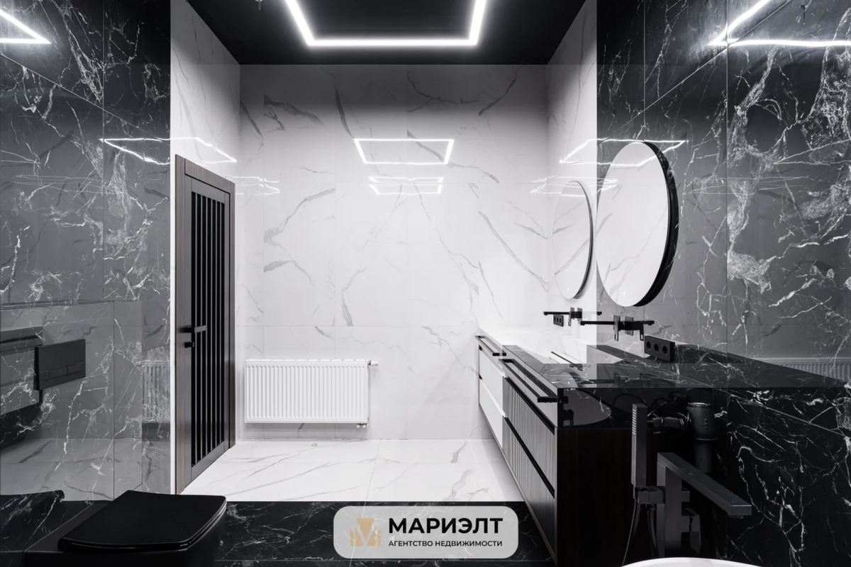 Зеркала в санузле будто бы визуально разделены на женское и мужское с помощью контрастных цветов: