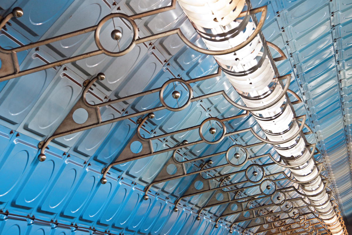 Станции аскетичны: путевые стены — голый бетон, колонны облицованы нержавейкой, скамейки — из той же стали. Все типовое и без намека на архитектурные флирты.