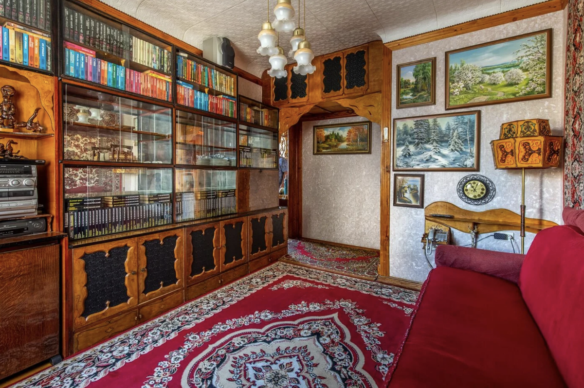 Внимание прежде всего привлекает обилие ковров, утепляющих полы и стену. Мебель явно сделана на заказ и принадлежит любителю резных узоров. А еще в квартире много книг и картин, что намекает на то, что раньше здесь жили творческие люди.