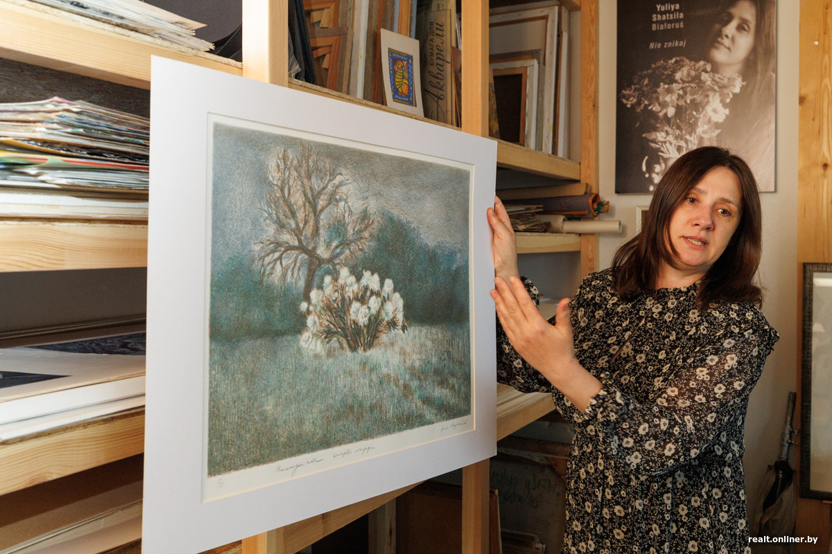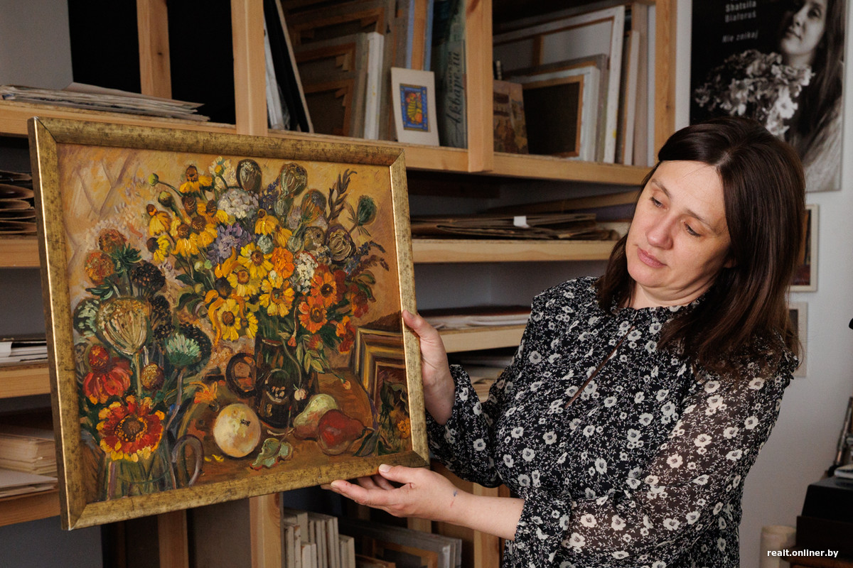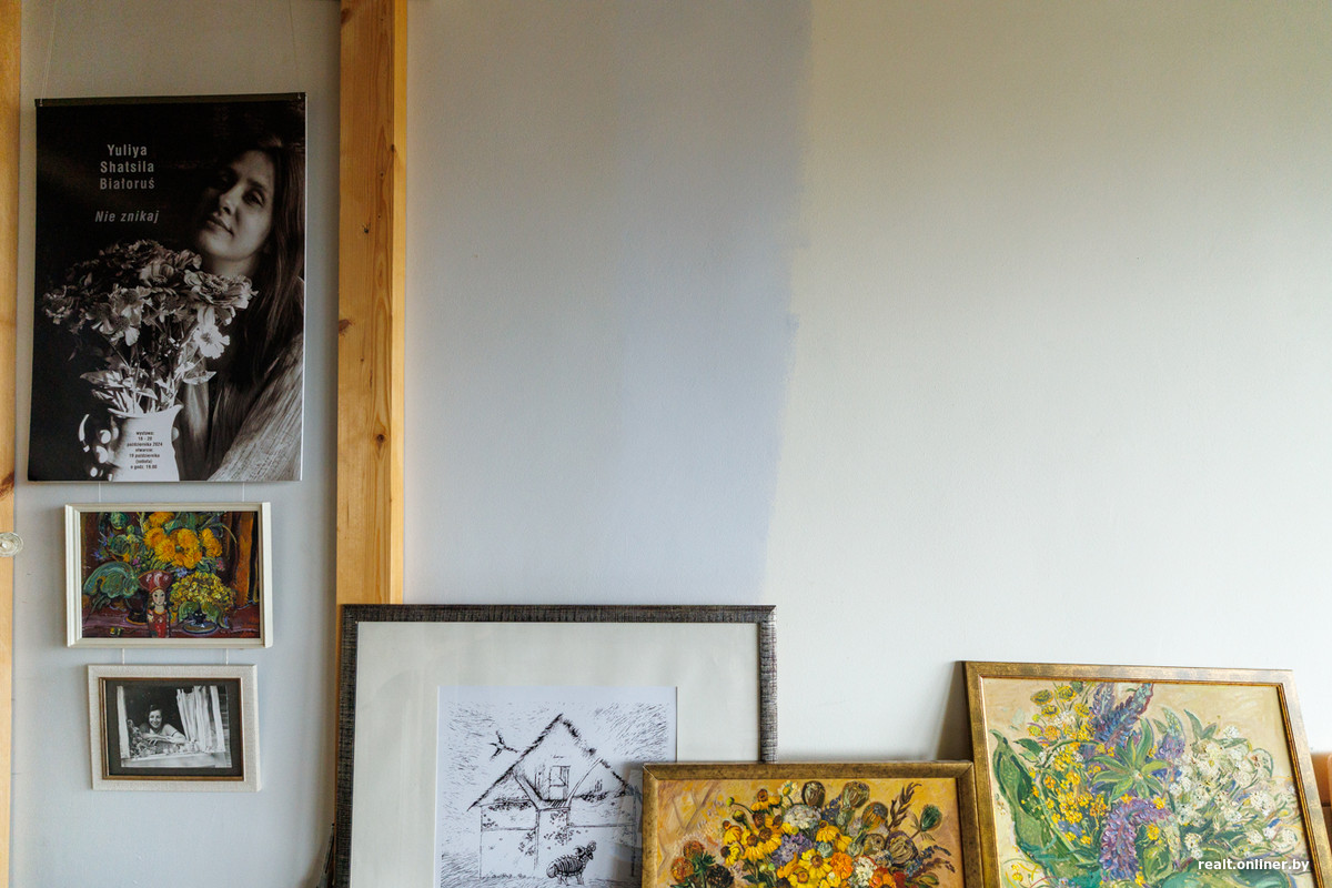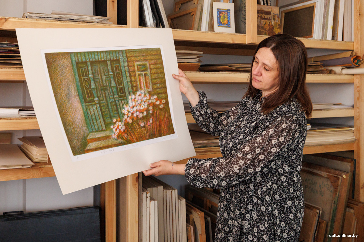 — Для мастака творчая майстэрня — гэта другі дом. Калі не першы. Усё духоўнае жыцце праходзіць тут, усе скарбы захоўваюцца тут. Вялікае шчасце, што яны належаць Саюзу мастакоў, а не людзям. Канешне, кожнаму з нас хацелася б, каб гэта была ўласная маёмасць, але тады б майстэрні праз некаторы час скончыліся і ніхто з новых (ды і ўжо паважных майстроў) не змог бы на іх разлічваць, — говорит Юлия и в первую очередь показывает нам работы своей наставницы Алены Лось, которой раньше и принадлежала эта мастерская.