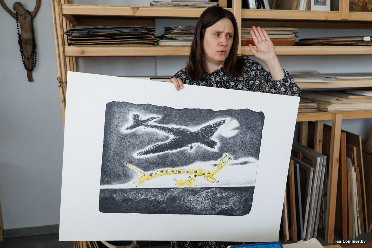 — Зноў да тэхнікі літаграфіі я вярнулася ў 2022 годзе. Разам з іншымі майстрамі літаграфіі мяне запрасілі прыняць удзел у выставе-сімпозіуме на ваенную тэму, якая праходзіла ў музеі Хатыні. Мастакам далі поўную свабоду выказвання, і вось што атрымалася, — демонстрирует художница.
