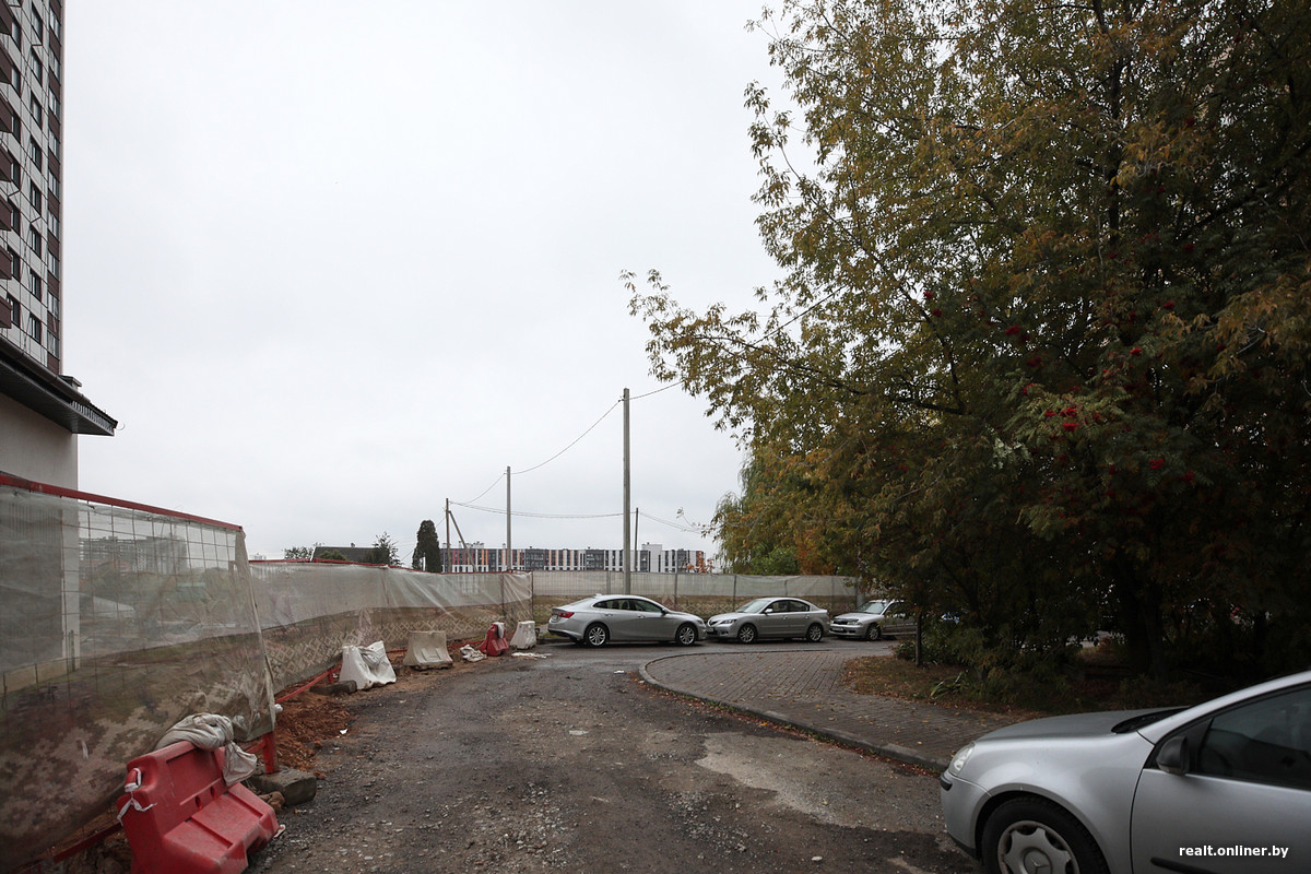 Претензий к стройке у жителей кирпичной многоэтажки масса. Самые главные заключаются в том, что возле дома осталось совсем немного парковочных мест, часть деревьев и кустарников вырубили, а детскую площадку огородили. Также отсутствует благоустройство с парадной стороны здания. Грязь на дорогах и тротуарах, перекрытие проезда крупногабаритной техникой — в этих фактах тоже мало приятного. И непонятно, когда все это закончится.