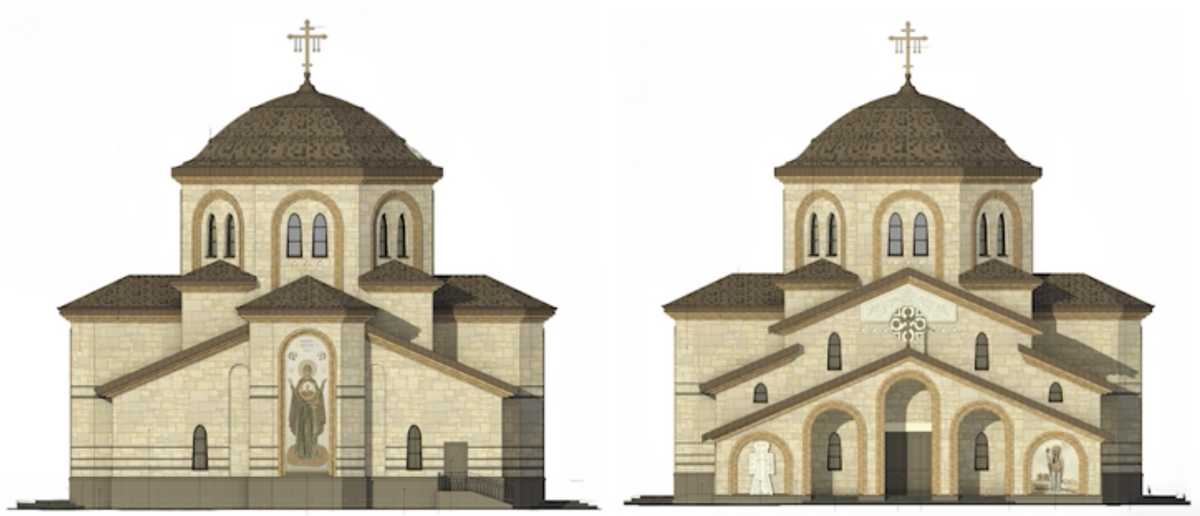 — Храм выполнен в традиционной манере проектирования православной грузинской архитектуры. Главный вход представляет собой аркадную галерею на всю ширину западного фасада. Здесь предполагается организовать вывод святой воды из бака, чтобы с улицы человек мог подойти и набрать воды, помолившись перед иконографическим образом.