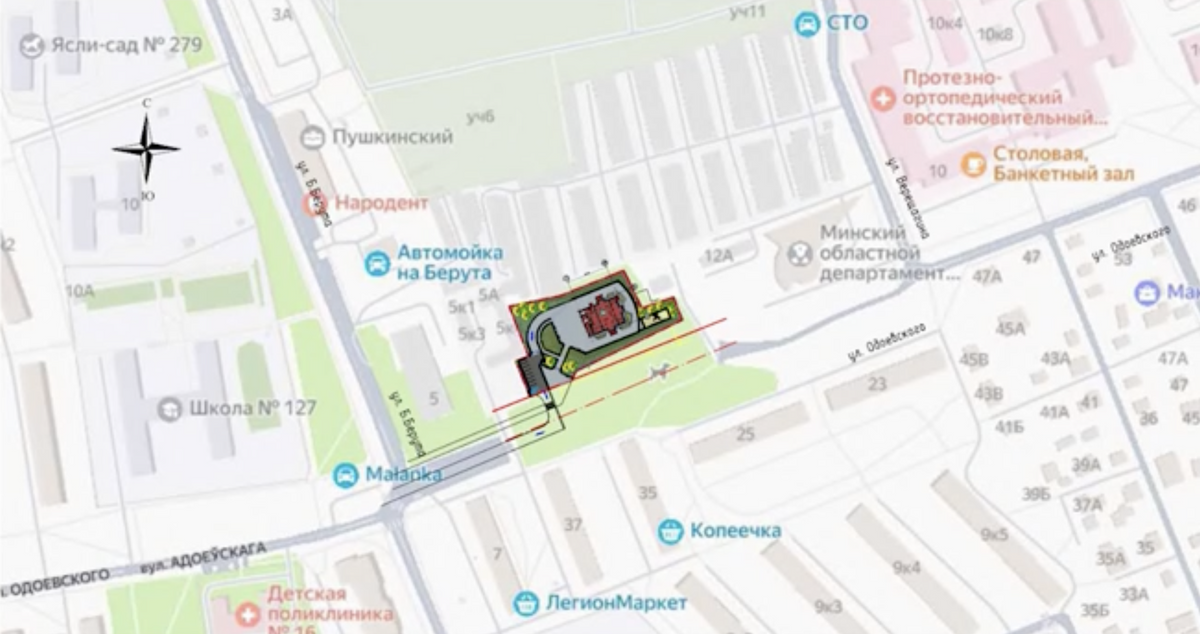 Храм расположится в зеленой зоне на пересечении улиц Одоевского и Болеслава Берута. Площадь участка — 0,3880 гектара. На нем появится также детская площадка, зона отдыха и малые архитектурные формы. Территорию облагородят газоном, кустарниками и деревьями. Возле храма разместят автомобильную стоянку.