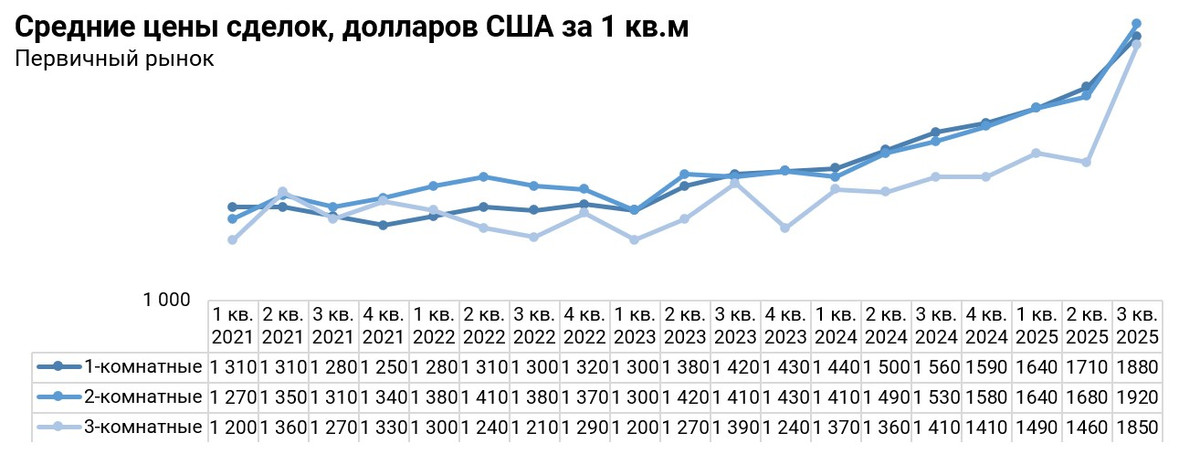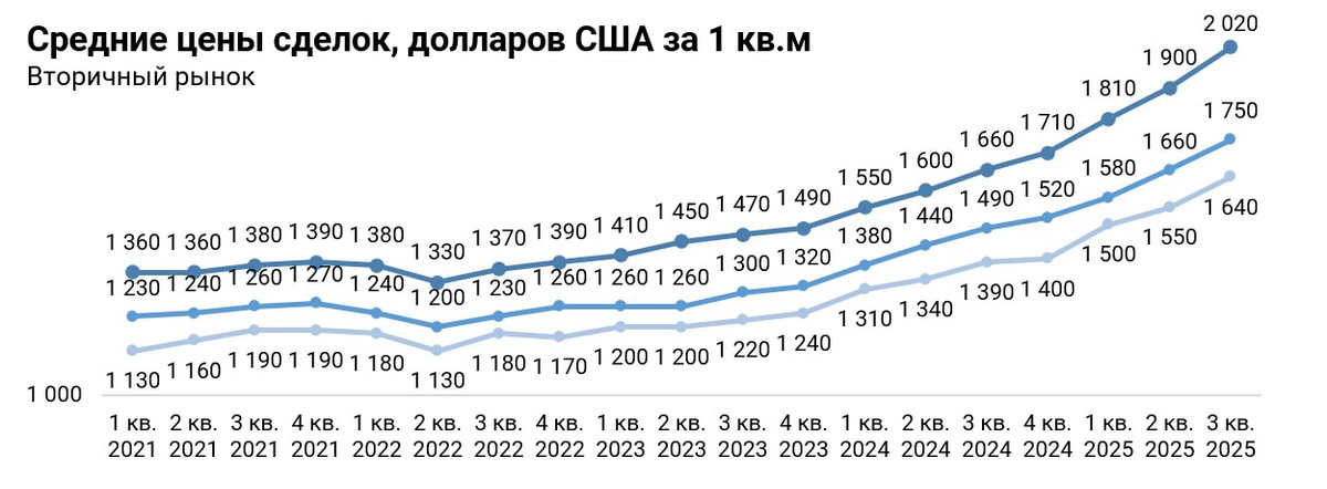 На вторичном рынке средняя цена на однокомнатные квартиры достигла $2000 за кв. м. Однушки в 2025 году дорожают интенсивнее, чем остальные, — плюс $90—120 за «квадрат». Двухкомнатные квартиры на вторичном рынке продавались в среднем за $1750, трехкомнатные — за $1640.