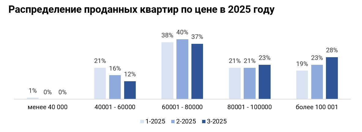 Наибольшее количество квартир продано за $60 000—80 000, что сопоставимо с предыдущими кварталами. Доля сделок с ценой выше $100 000 также увеличилась.