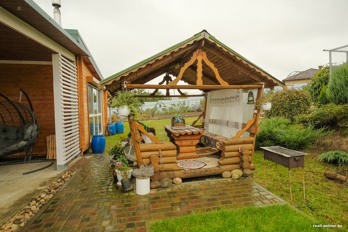— Если честно, после неудачного опыта с каркасником я боялась снова ввязываться в стройку, поэтому все другие сооружения (баня, курятник, павлинник) купила готовыми. В том числе этот домокомплект, — показывает в сторону уютного домика из бруса Мария. — Его сделали на производстве, привезли на участок и поставили на свайный фундамент. Дом не утеплен, поэтому зимой в нем холодно. Ситуацию спасает буржуйка. В целом постройка обошлась мне в $12 000: рабочие сложили ее за три дня. Чуть позже я решила украсить дом резными деталями и достроить 6-метровый навес, который сегодня спасает от осадков и создает на участке дополнительную зону отдыха. К слову, первый раз, когда пошел дождь, в домокомплекте вскрылся нюанс: щели пропускали влагу, поэтому проблему пришлось быстро устранять. Снаружи — герметиком, внутри — дополнительным утеплением.