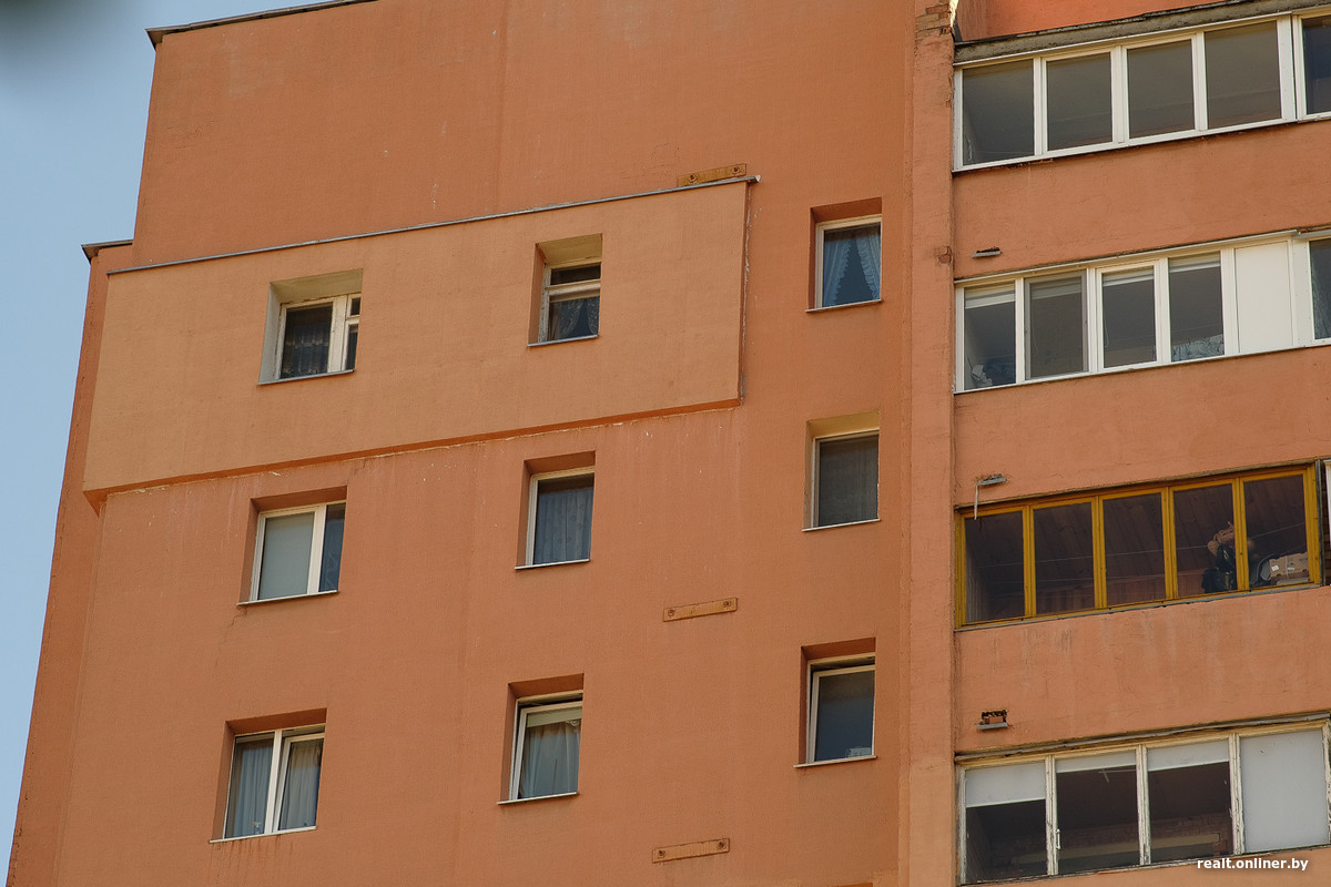 Там, на уровне 6-го и выше, на фоне красного кирпича действительно проглядывают замаскированные под краской металлические пластинки. По словам минчан, эту многоэтажку из красного кирпича сдали в эксплуатацию в 1989 году.
