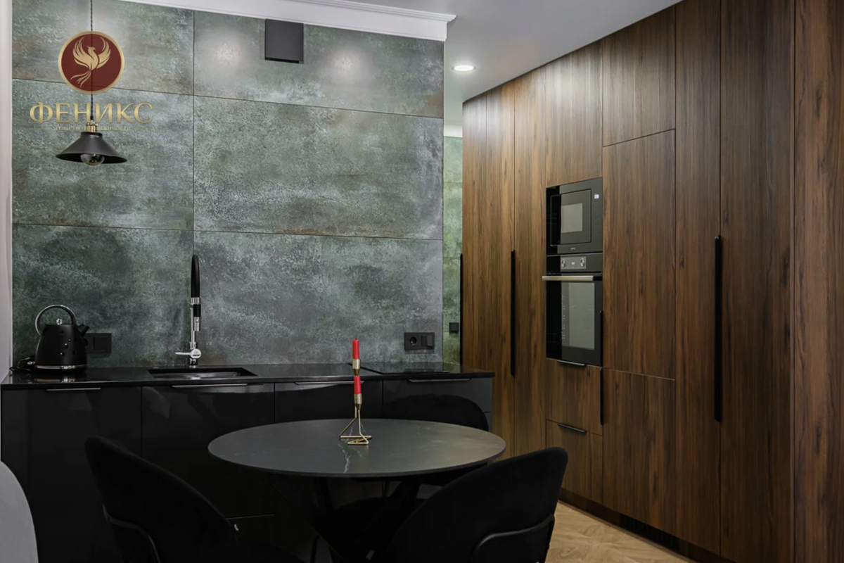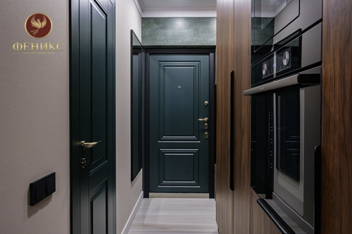 Не боятся люди и темных интерьеров, которые якобы визуально уменьшают пространство. Студия площадью 26 метров на улице Пилотной выполнена в глубоких изумрудных и коричневых оттенках.