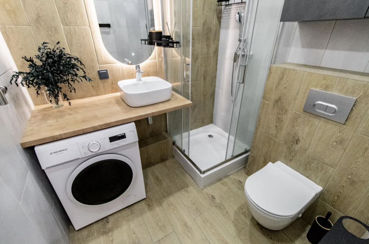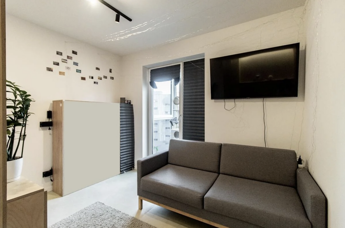 В целом получился такой гостиничный вайб — небольшие номера в отелях зонируются примерно так. Для приготовления еды выделен совсем небольшой кусочек. Кухонную технику спрятали в шкафу в прихожей. В квартире нашлось место для довольно большой кровати, лежа на которой можно смотреть телевизор — прямо как в гостиницах. Санузел совсем небольшой — ванная тут не поместилась, но есть лаконичная душевая кабина.