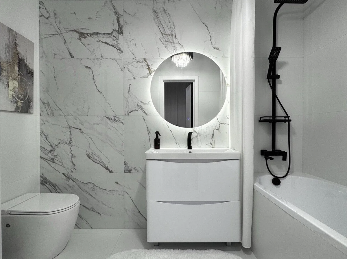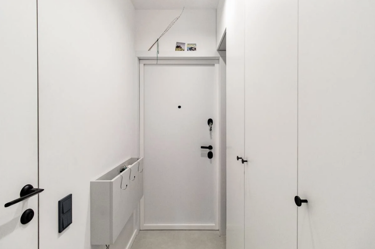 Прихожая получилась минималистичной и белоснежной — ничего лишнего. В санузле продолжается стилистика основной зоны.