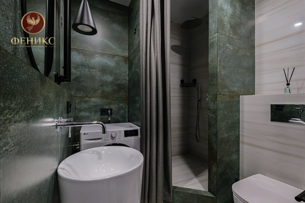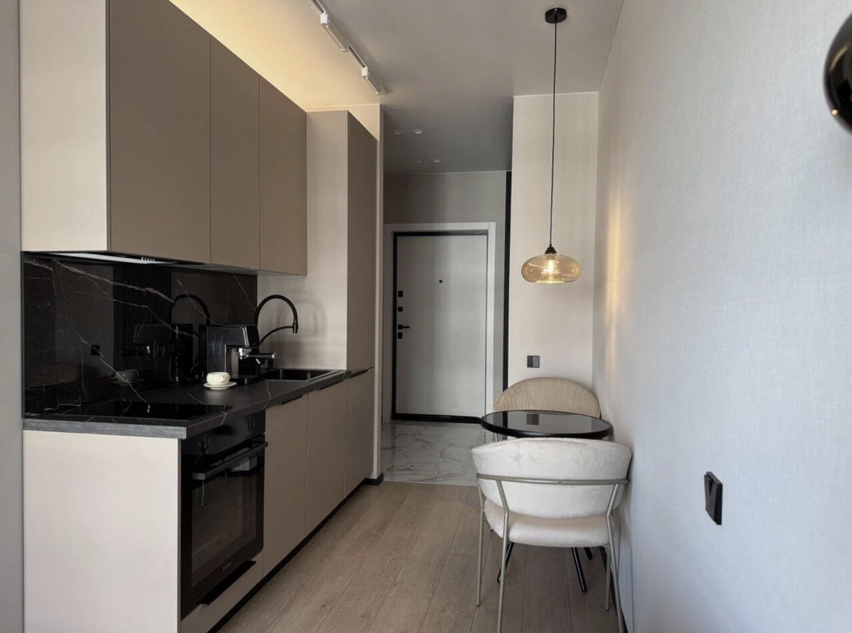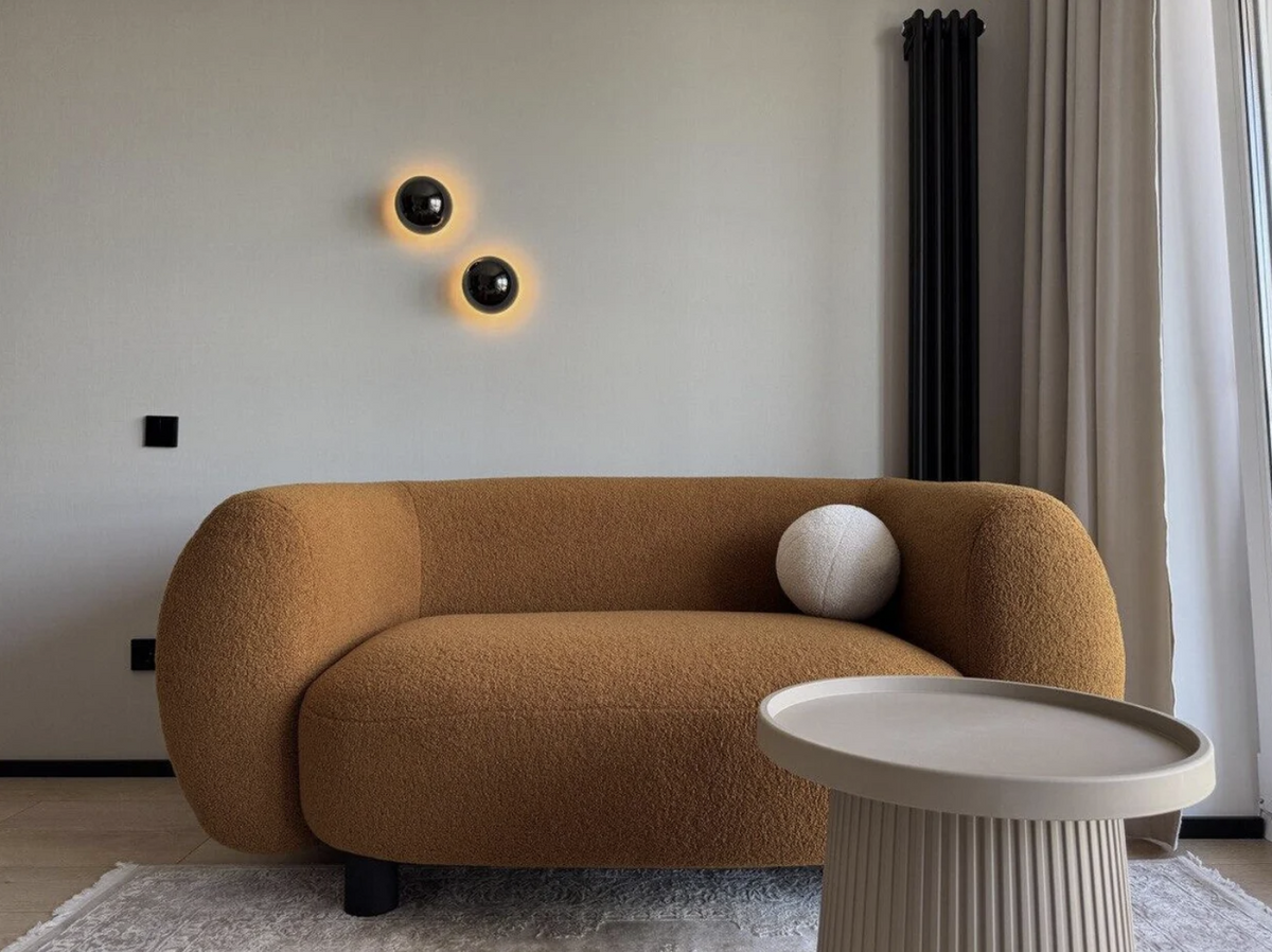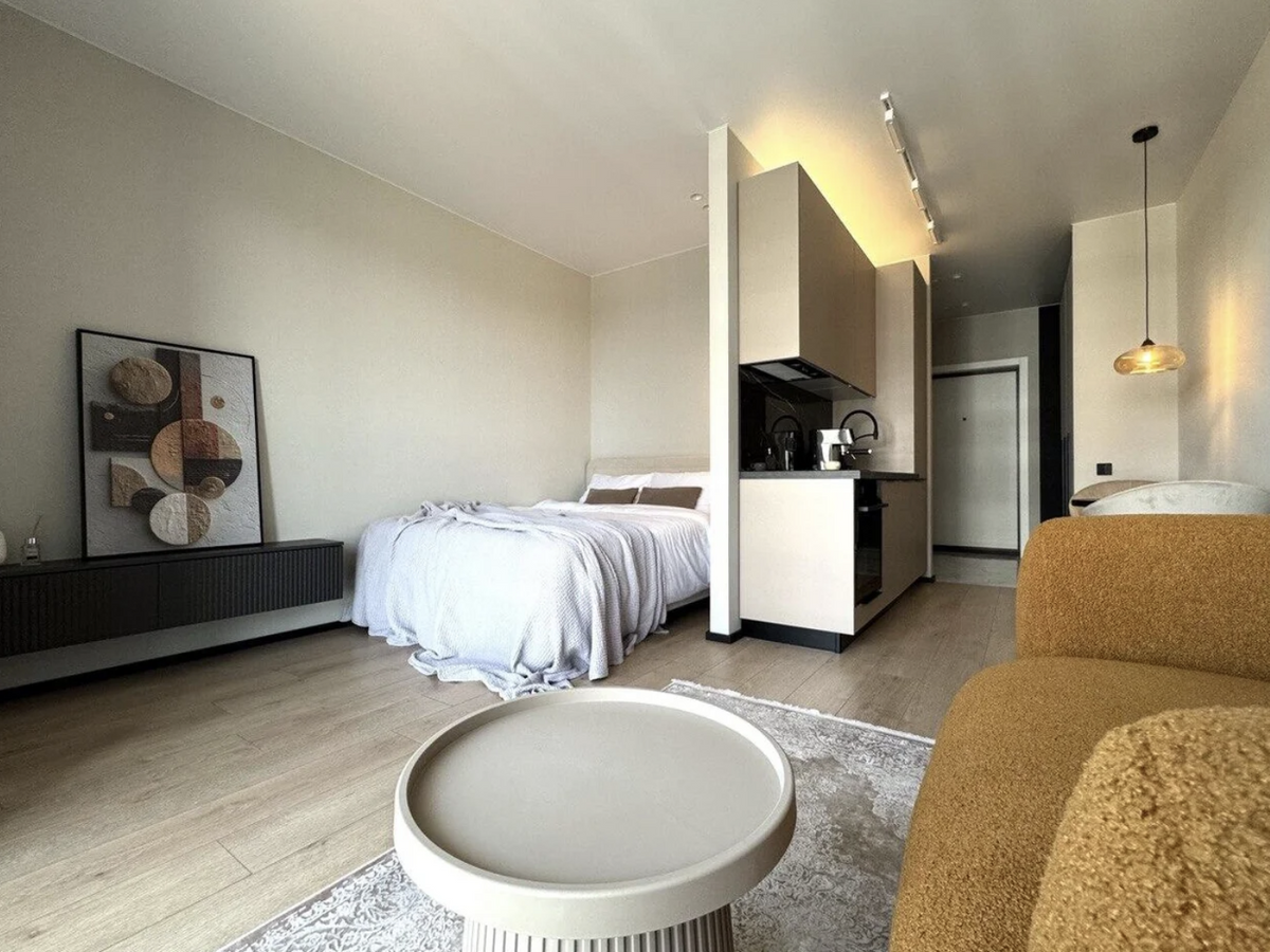 Интересную концепцию воплотили владельцы этой квартиры площадью 30 метров, которая располагается на улице Камова. Здесь подумали не только о эргономичном зонировании помещения, но и о дизайнерской составляющей. Зона с диваном, журнальным столиком и фотогеничным светильником — это готовая локация для съемки рилсов в инстаграм.