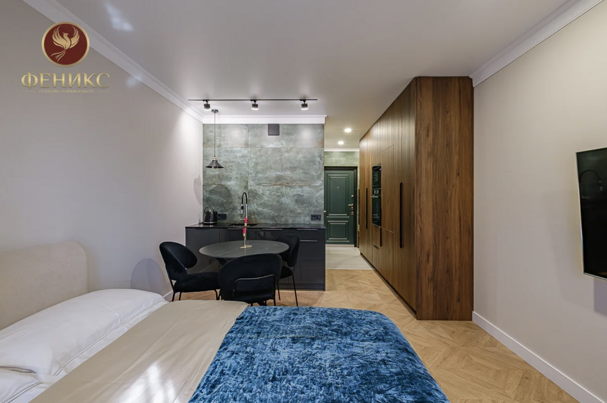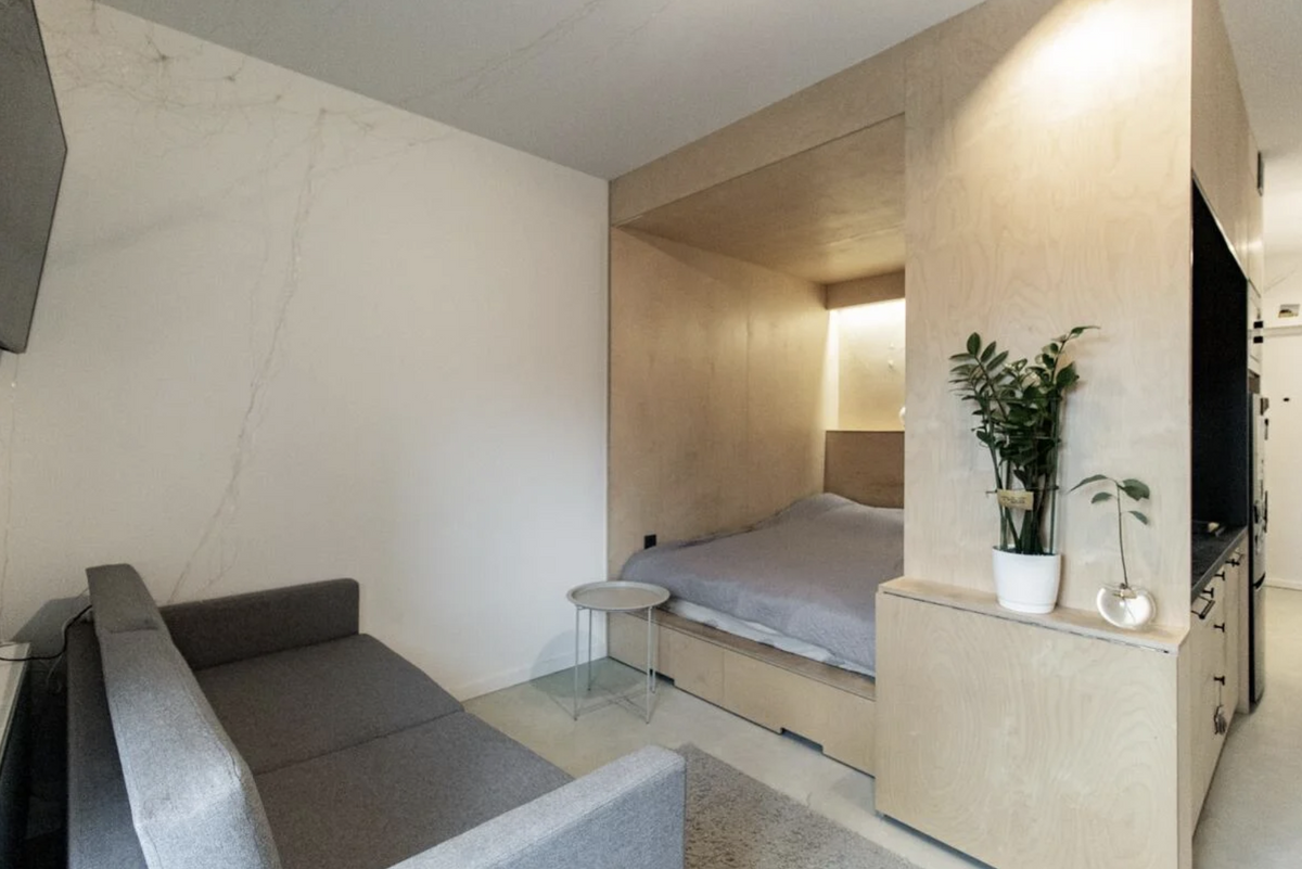 Площадь этой квартиры на улице Пилотной — всего 25 метров. Любопытно, что в середине студии установлена монолитная деревянная конструкция для размещения спальной и кухонной зоны. Под кроватью предусмотрели зону для хранения вещей — в стесненном пространстве это очень хорошее решение.