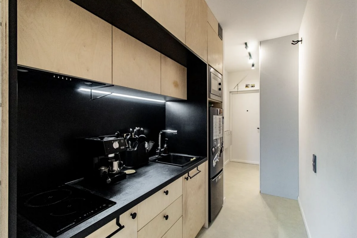 Интересно, что в квартире поместились сразу и диван, и кровать. Место для сна спрятали в нишу, перегородка которой является продолжением кухни. Сама кухня совсем малюсенькая, но снабжена всем необходимым: варочная панель, духовой шкаф, холодильник, кофемашина и даже посудомоечная машина. В ванной оказалось достаточно места для размещения ванны.