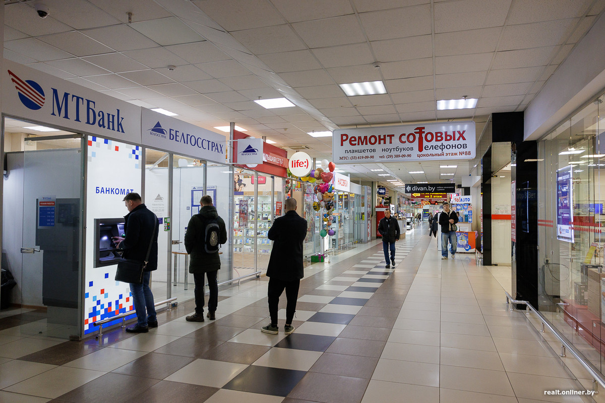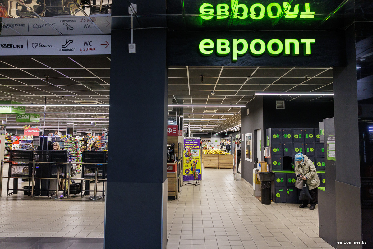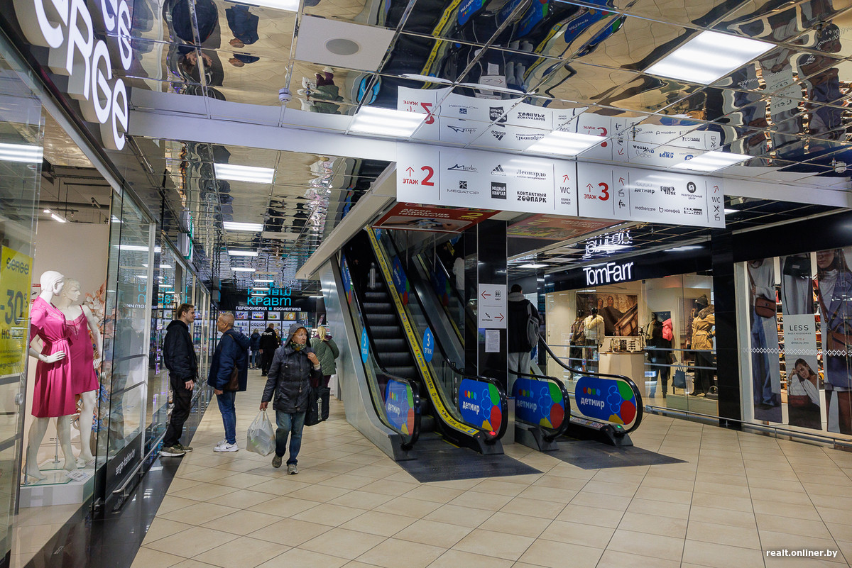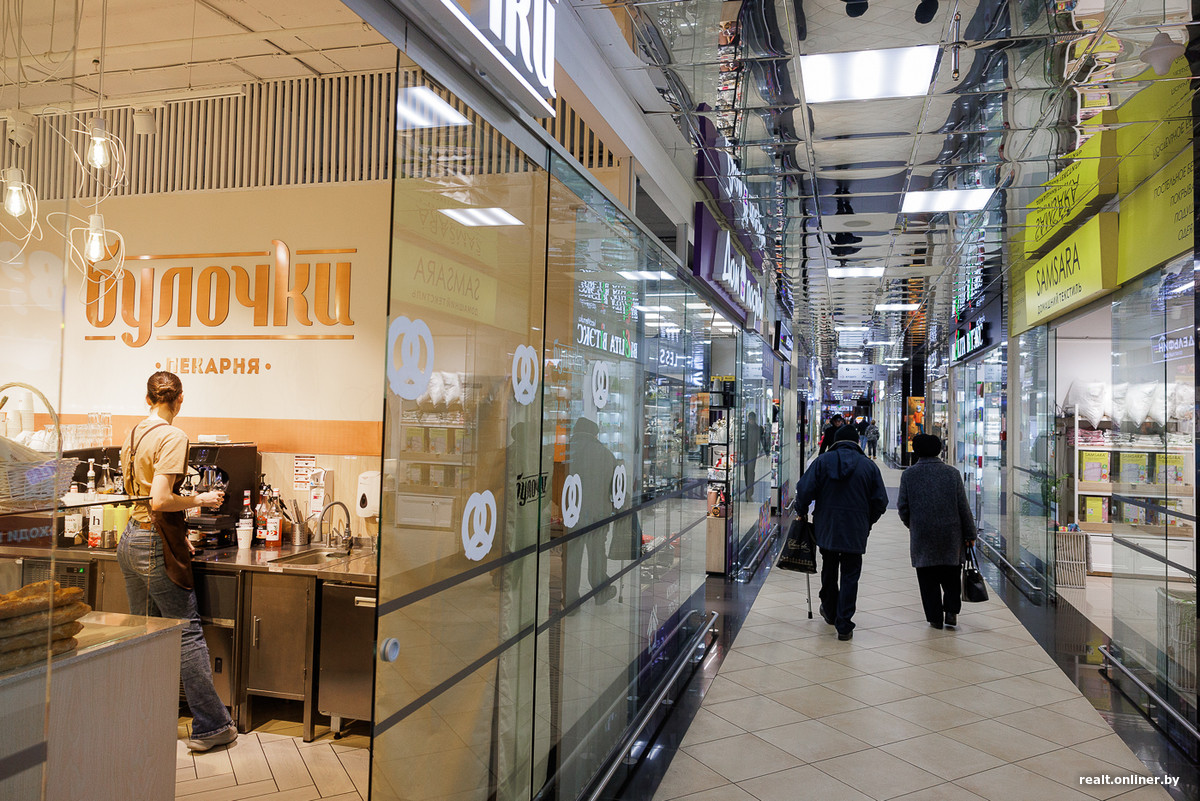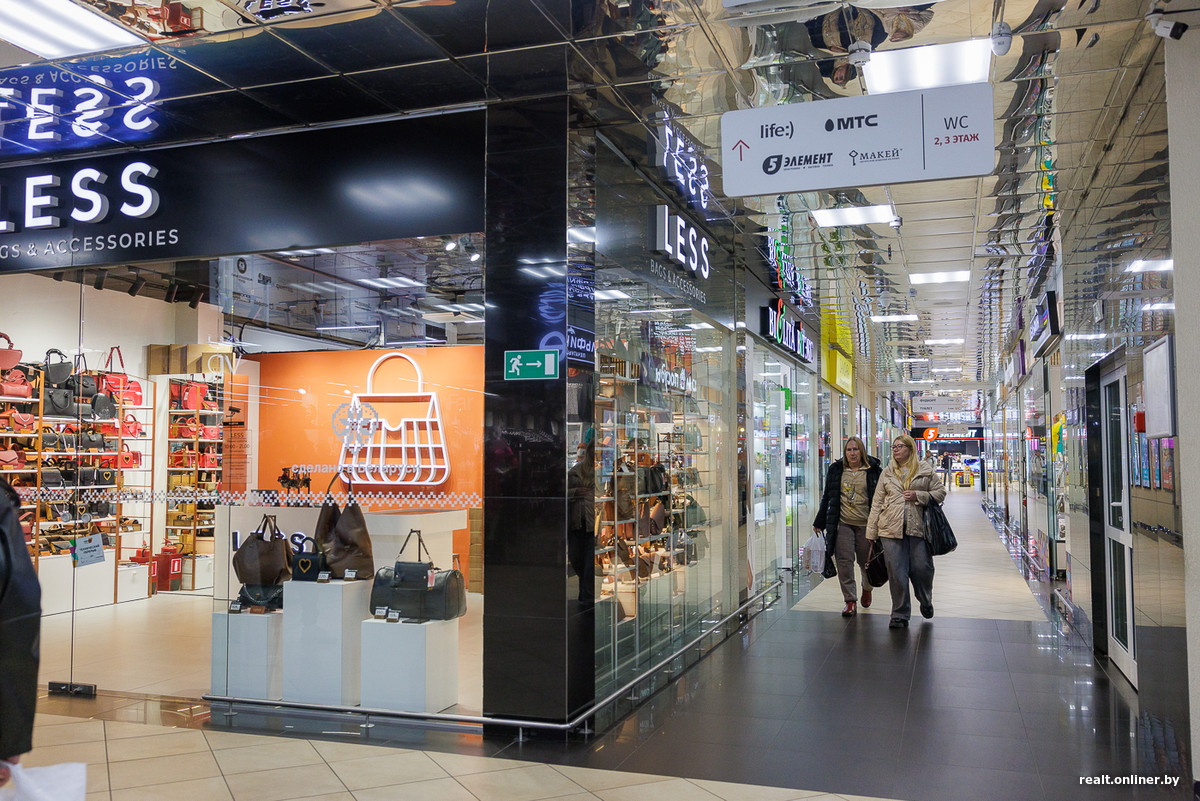 Снаружи «Титан» выглядит внушительно: стеклянный фасад, офисные башни и аж шесть входов, в которых можно запутаться, если приходишь сюда впервые. На первом этаже всего понемногу: дорогим блеском манит Ziko, приятными ароматами — «Кравт», сумками — бренды Less и Makey. «Евроопт» без покупателей тоже не остается, да и в другие магазины люди заглядывают: кто-то выбирает текстиль в «Белорусском льне» или Samsara, кто-то развлекается с демонстрационными образцами смартфонов в «5 элементе». В кофейне «Булочки» несколько девушек балуют себя капучино и десертами. Кажется, жизнь здесь и правда теплится. Хотя местные продавцы едва ли с этим согласятся.