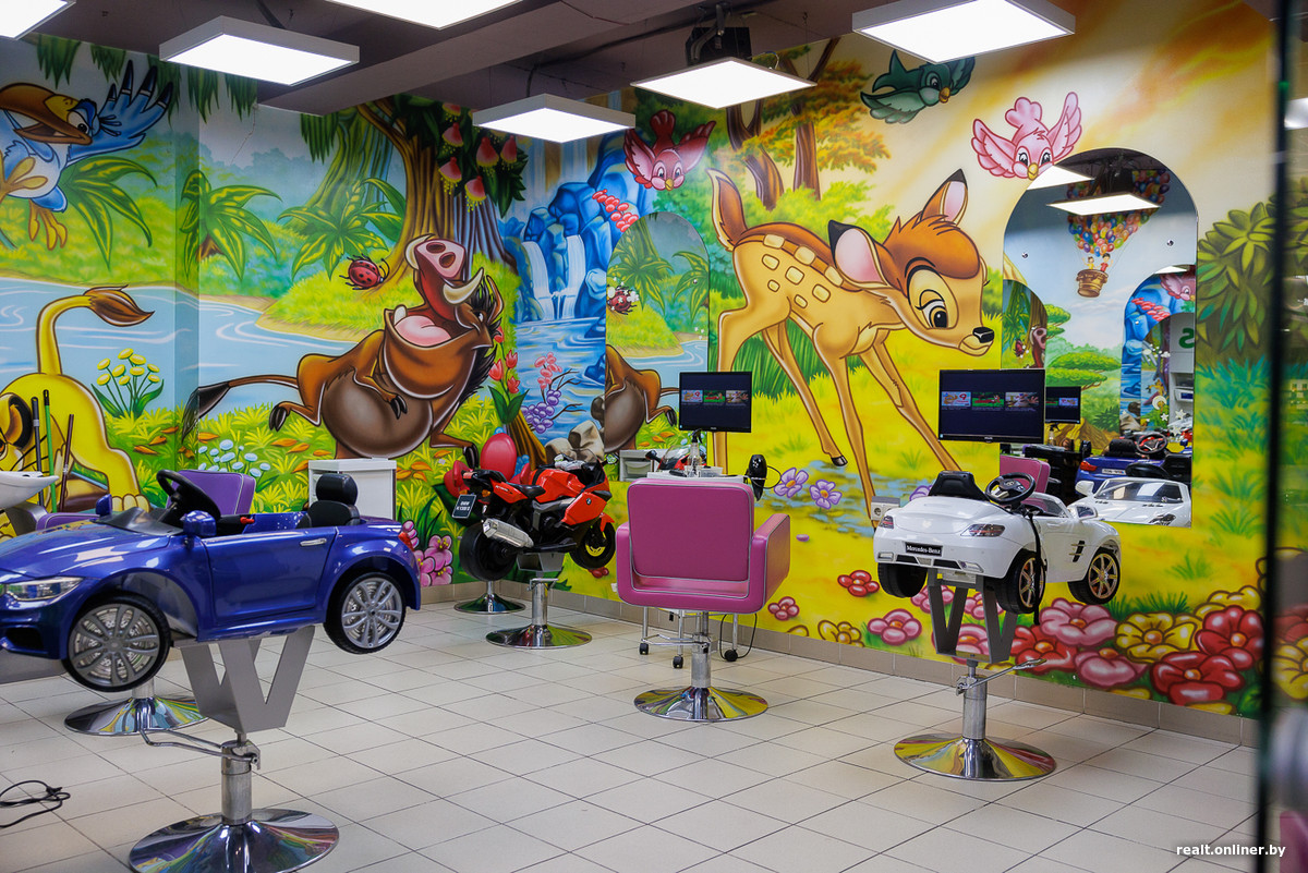 Ну а мы пока не уходим — направляемся на третий этаж. Людской поток тут заметно снижается — все-таки это детская зона, и набор товаров соответствующий: коляски, игрушки, микровещи и сладости. Даже в парикмахерской тут вместо привычных кресел — машинки. Предполагаем, что на выходных дела здесь идут лучше. Но сегодня даже у игровых автоматов, переливающихся неоном, пусто. На фотозоне с уже теряющими актуальность лабубу тоже никого.