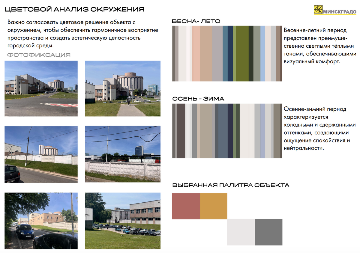 — Для визуально-эстетического восприятия территории при размещении объекта необходимо предусмотреть мероприятия по ограждению участка посредством зеленых насаждений, декоративных экранов. Предлагаются монументальные оградительные экраны с объемными элементами, повернутыми под разными углами. Такая композиция создает динамичный рисунок, который меняется в зависимости от точки обзора и формирует ощущение легкой полупрозрачности. Рекомендуется включение вертикального озеленения.