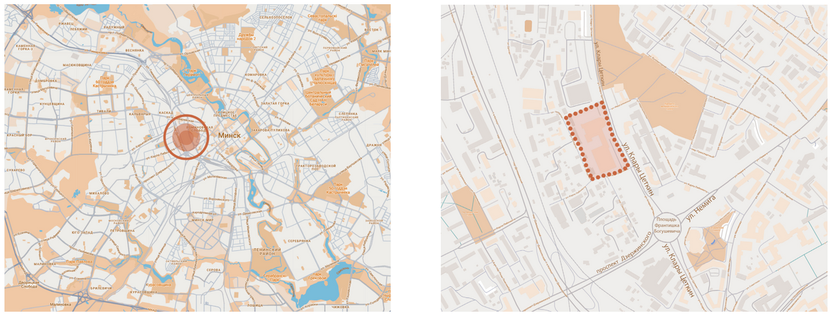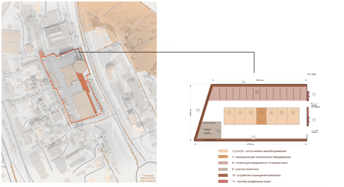 Участок площадью 3,23 га расположен по адресу улица Карла Либкнехта, 54/35. Рядом — оживленная улица Клары Цеткин, станция метро «Площадь Франтишка Богушевича», жилой комплекс «Маэстро», бизнес-центр. Мойка будет примыкать к известному минчанам зданию круглой формы — оно построено в 1983—1985 годах как многоэтажный гараж-стоянка Управления делами Совета министров БССР.