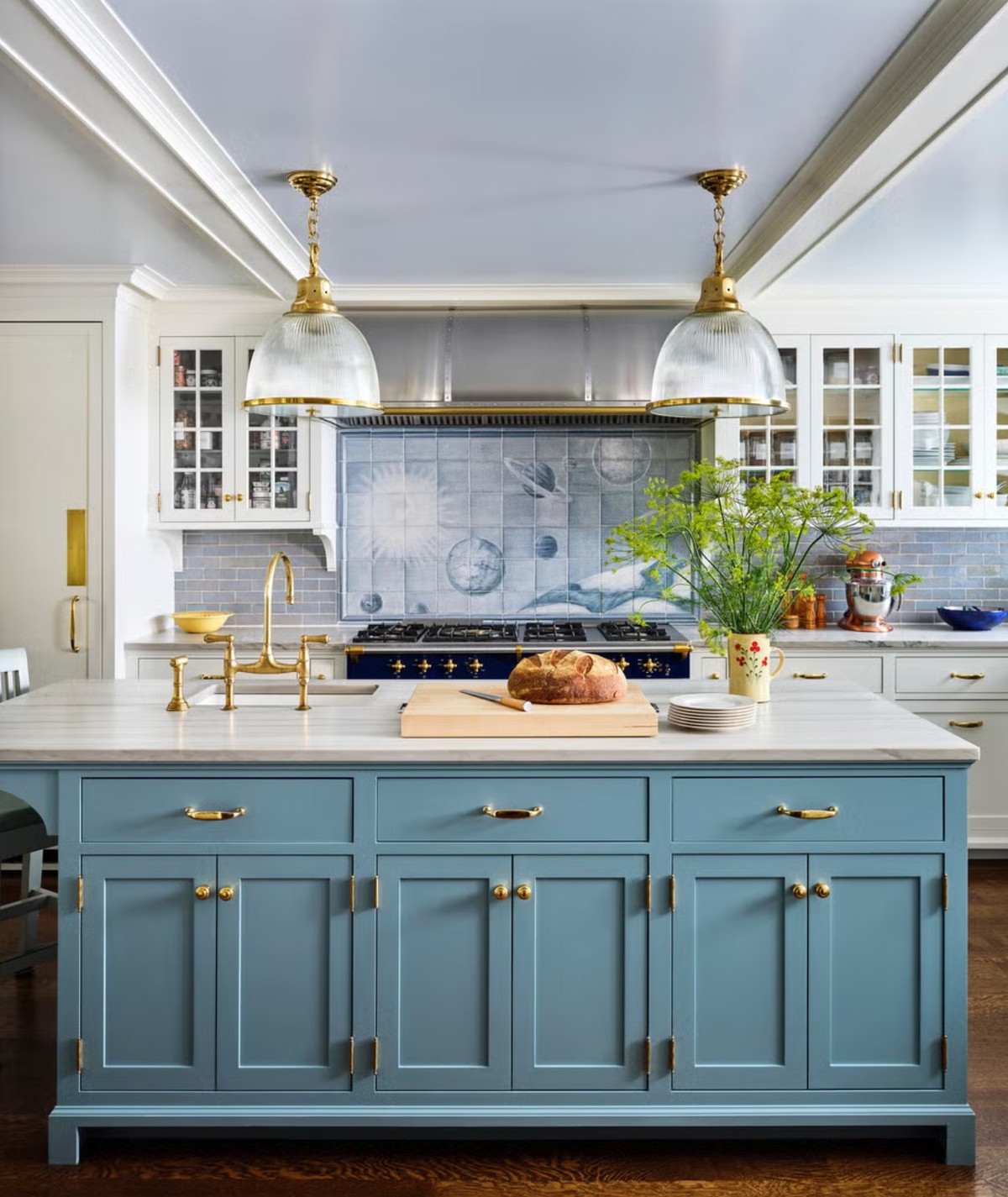 В интерьерах заметны нотки классического стиля, но без музейной строгости. Современное искусство добавляет акцентов, а едва заметные астрономические мотивы придают пространству характер. В библиотеке — люстра с фигурами зодиака, на кухне — фартук с изображением Солнечной системы, в детской — кровать-домик и обои со звездным небом.