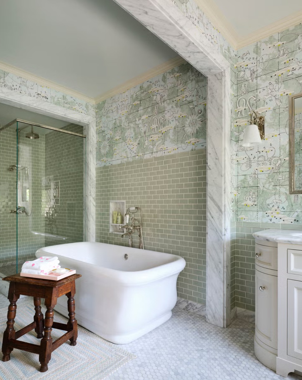 Цветовая палитра интерьеров выбрана светлая и уютная: солнечные желтые, мятные, розовые и голубые оттенки сочетаются с полосками, дамасками и цветочными принтами. Текстуры дерева и мрамора перекликаются с коврами — старинными и современными, создавая гармонию времени и фактур.