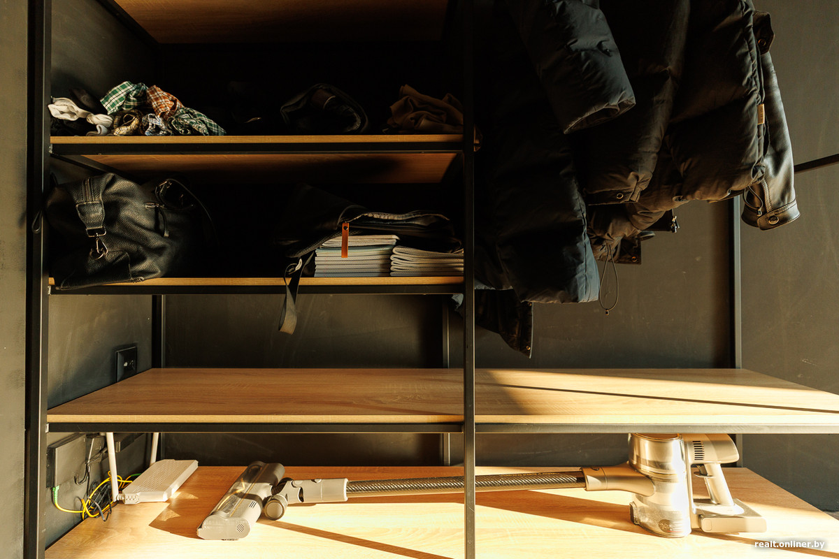 Нельзя не заметить, что в однушке почти нет шкафов и полок. Стеллаж у входа — единственное место для хранения вещей. Но даже полки небольшого стеллажа и то не все заняты вещами. Нерсес объясняет: