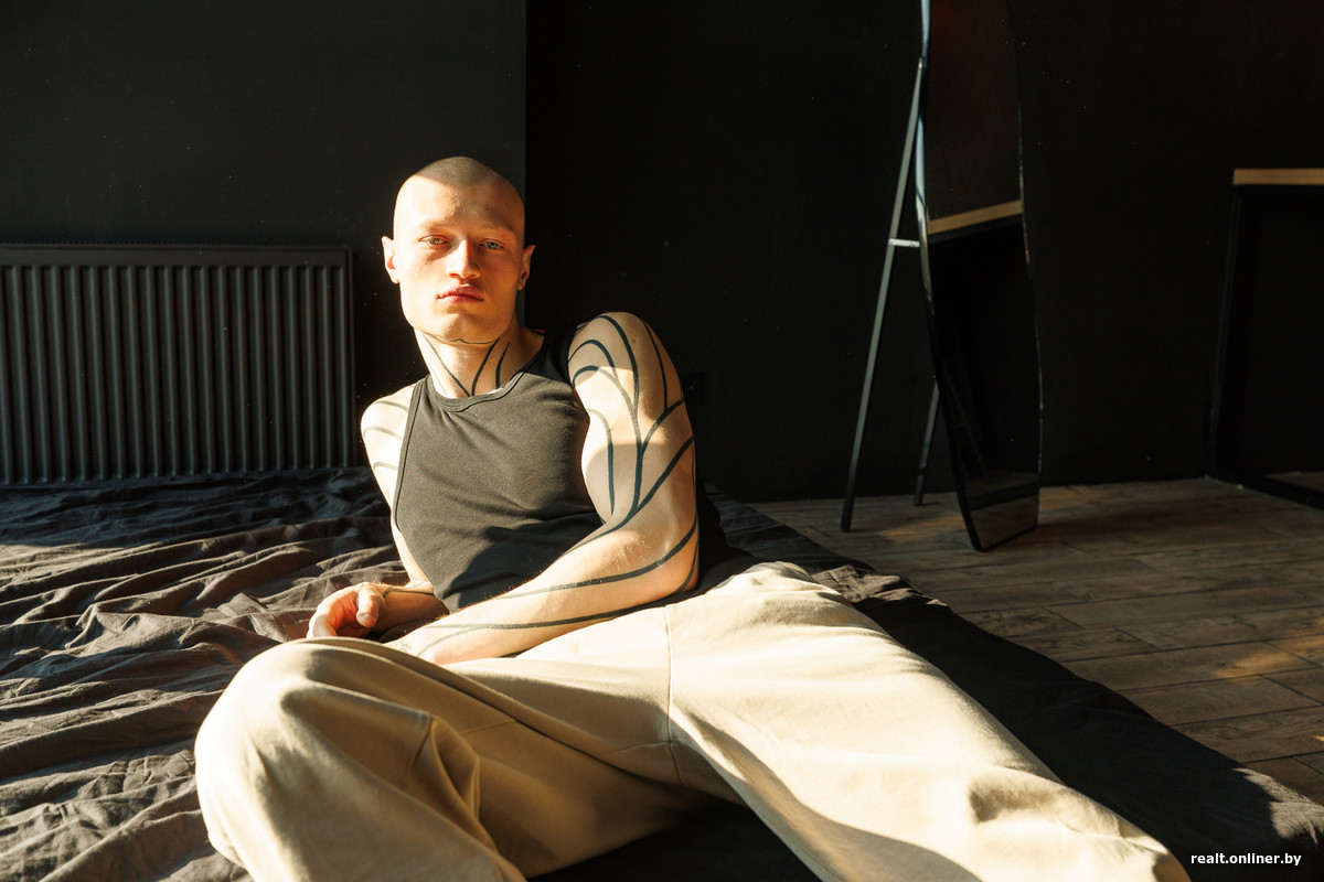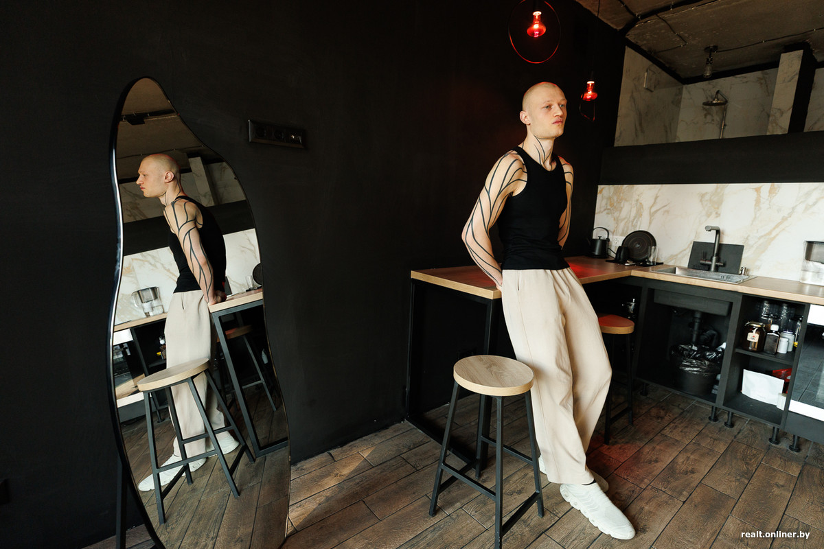 «Экзистенциальный кризис выглядит так», «Это чисто Тайлер Дерден», «Что здесь вообще происходит?» — такие комментарии можно прочитать под рилсами Нерсеса. Минчанин пару месяцев назад полностью перекроил свою квартиру: покрасил стены в черный цвет, «обнажил» ванную комнату, убрал все лишнее. Изменению подверглась и внешность — теперь у парня нет волос, а все тело покрыто загадочным орнаментом. Сам он признается: модификации произошли одномоментно, стали результатом кризиса личности и поиска смыслов. Транслируя эти откровения в социальную сеть, Нерсес обнаружил, что людям они откликаются. Onlíner побывал в квартире радикального минималиста, ставшей холстом для самовыражения.